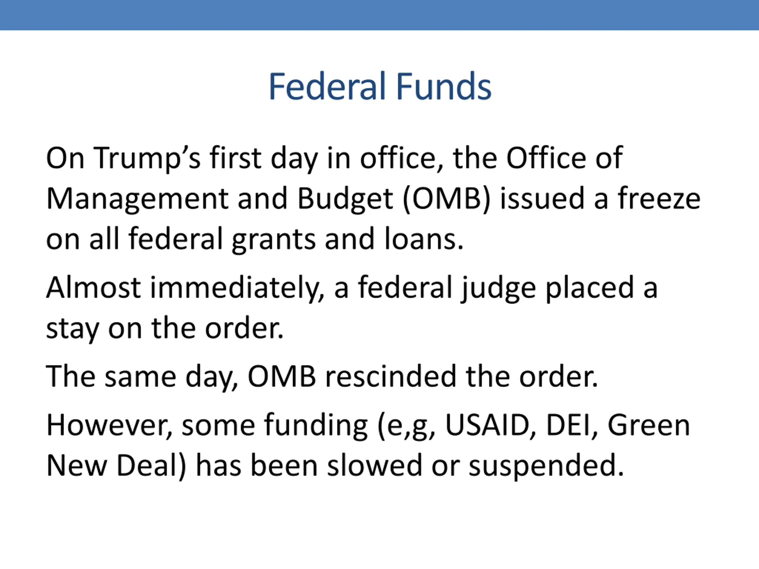 Federal Funds On Trump s first day in office, the Office of Management and Budget (OMB) issued a freeze on all federal grants and loans. Almost immediately, a federal judge placed a stay on the order. The same day, OMB rescinded the order. However, some funding (e,g, USAID, DEI, Green New Deal) has been slowed or suspended.