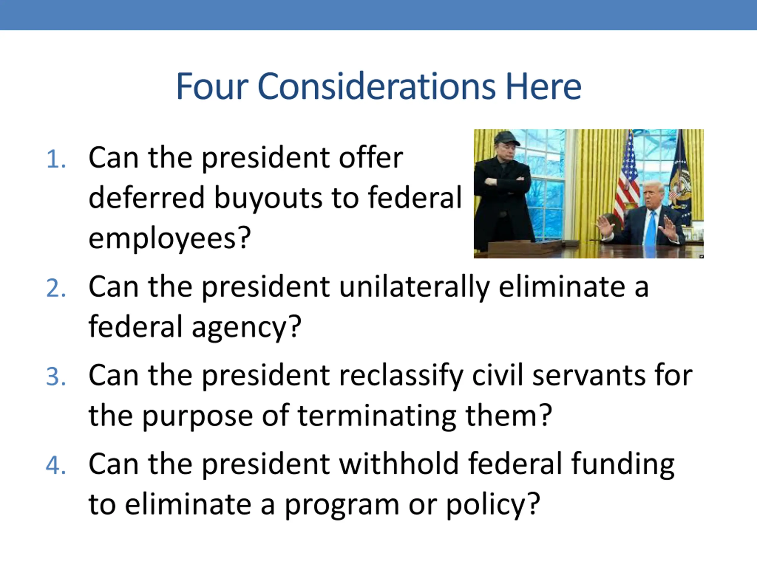 Four Considerations Here 1. Can the president offer deferred buyouts to federal employees? 2. Can the president unilaterally eliminate a federal agency? 3. Can the president reclassify civil servants for the purpose of terminating them? 4. Can the president withhold federal funding to eliminate a program or policy?