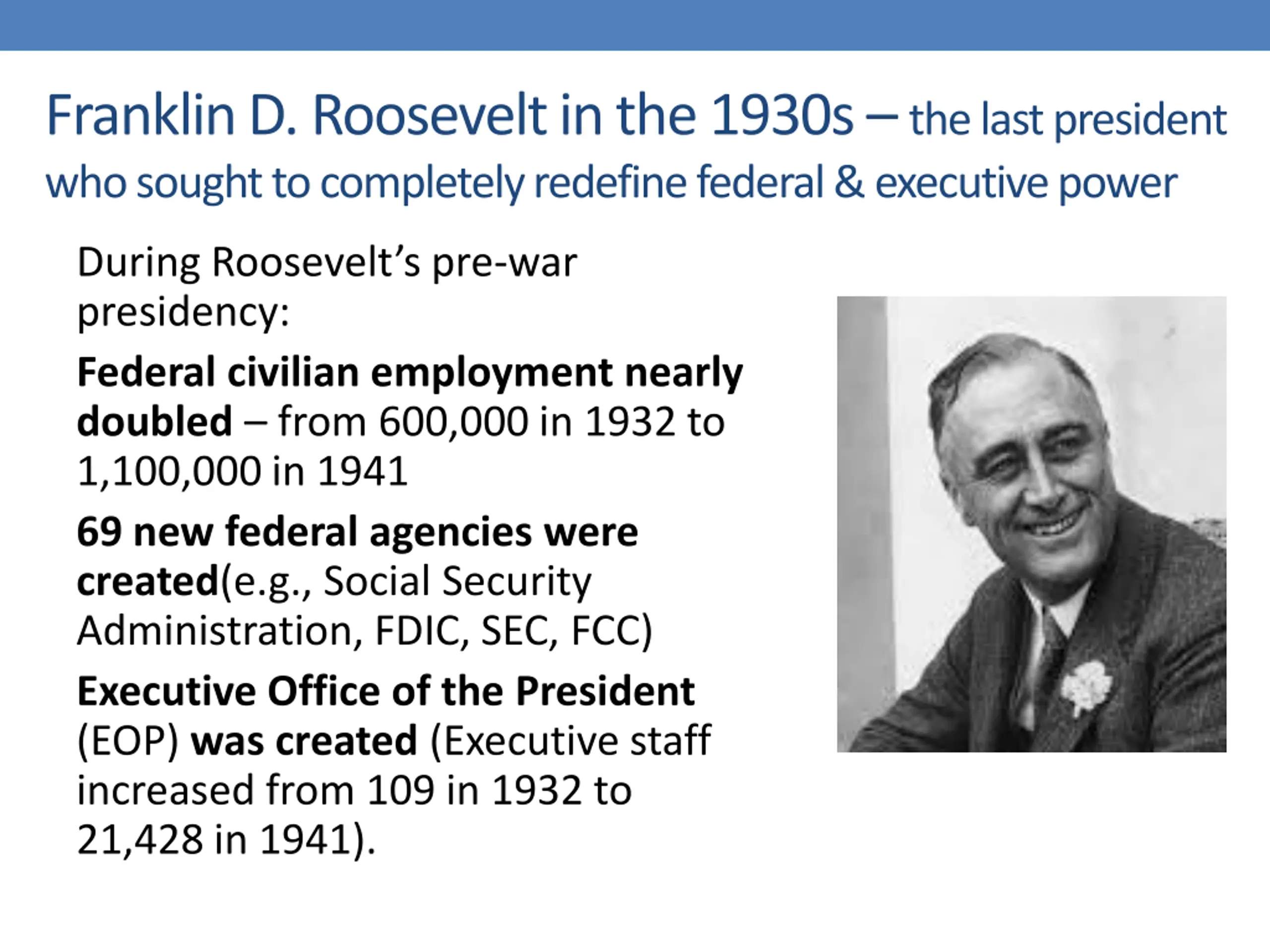 Franklin D. Roosevelt in the 1930s the last president who sought to completely redefine federal & executive power During Roosevelt s pre-war presidency: Federal civilian employment nearly doubled from 600,000 in 1932 to 1,100,000 in 1941 69 new federal agencies were created(e.g., Social Security Administration, FDIC, SEC, FCC) Executive Office of the President (EOP) was created (Executive staff increased from 109 in 1932 to 21,428 in 1941).