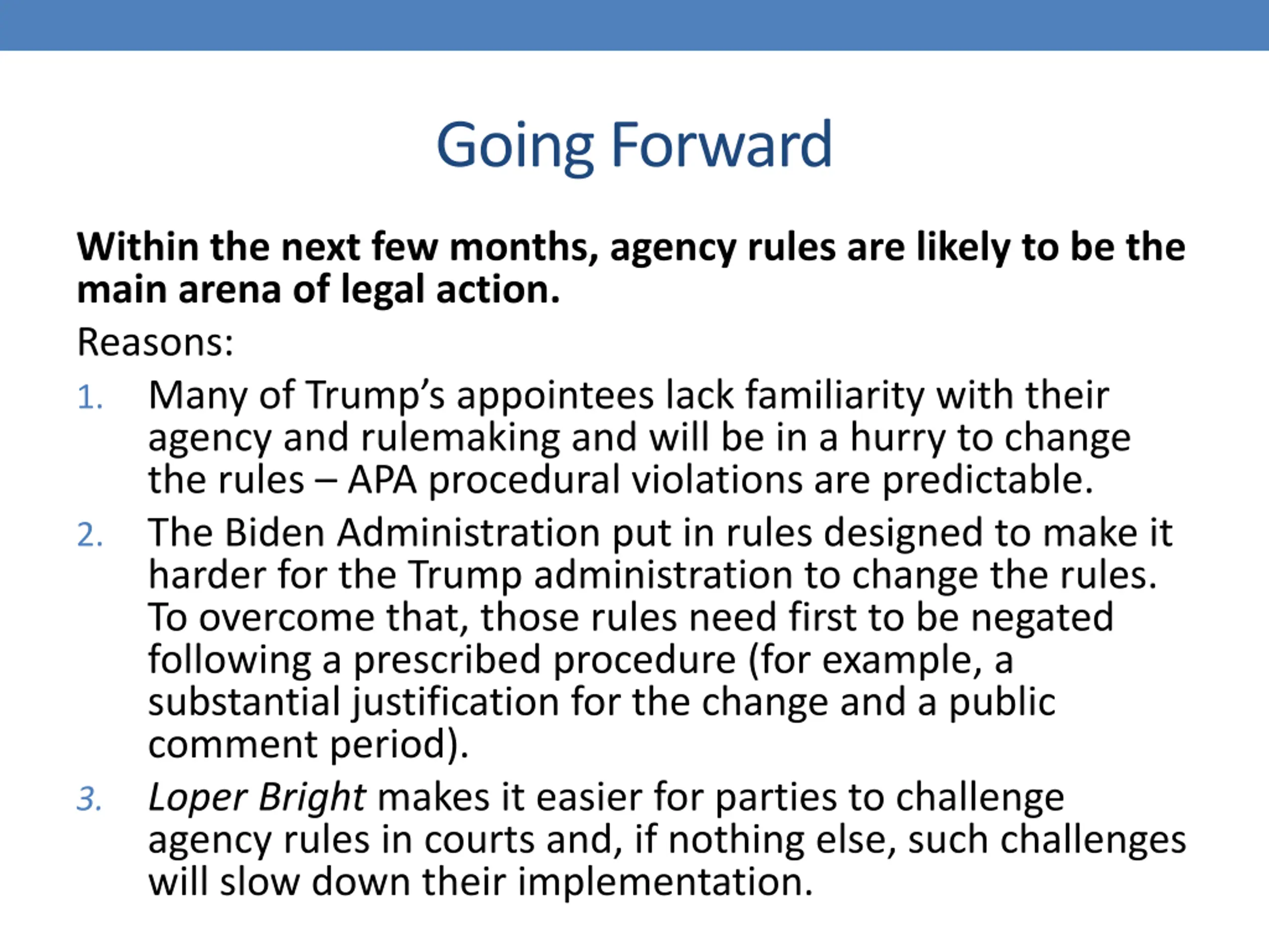 Going Forward Within the next few months, agency rules are likely to be the main arena of legal action. Reasons: 1. Many of Trump s appointees lack familiarity with their agency and rulemaking and will be in a hurry to change the rules APA procedural violations are predictable. 2. The Biden Administration put in rules designed to make it harder for the Trump administration to change the rules. To overcome that, those rules need first to be negated following a prescribed procedure (for example, a substantial justification for the change and a public comment period). 3. Loper Bright makes it easier for parties to challenge agency rules in courts and, if nothing else, such challenges will slow down their implementation.