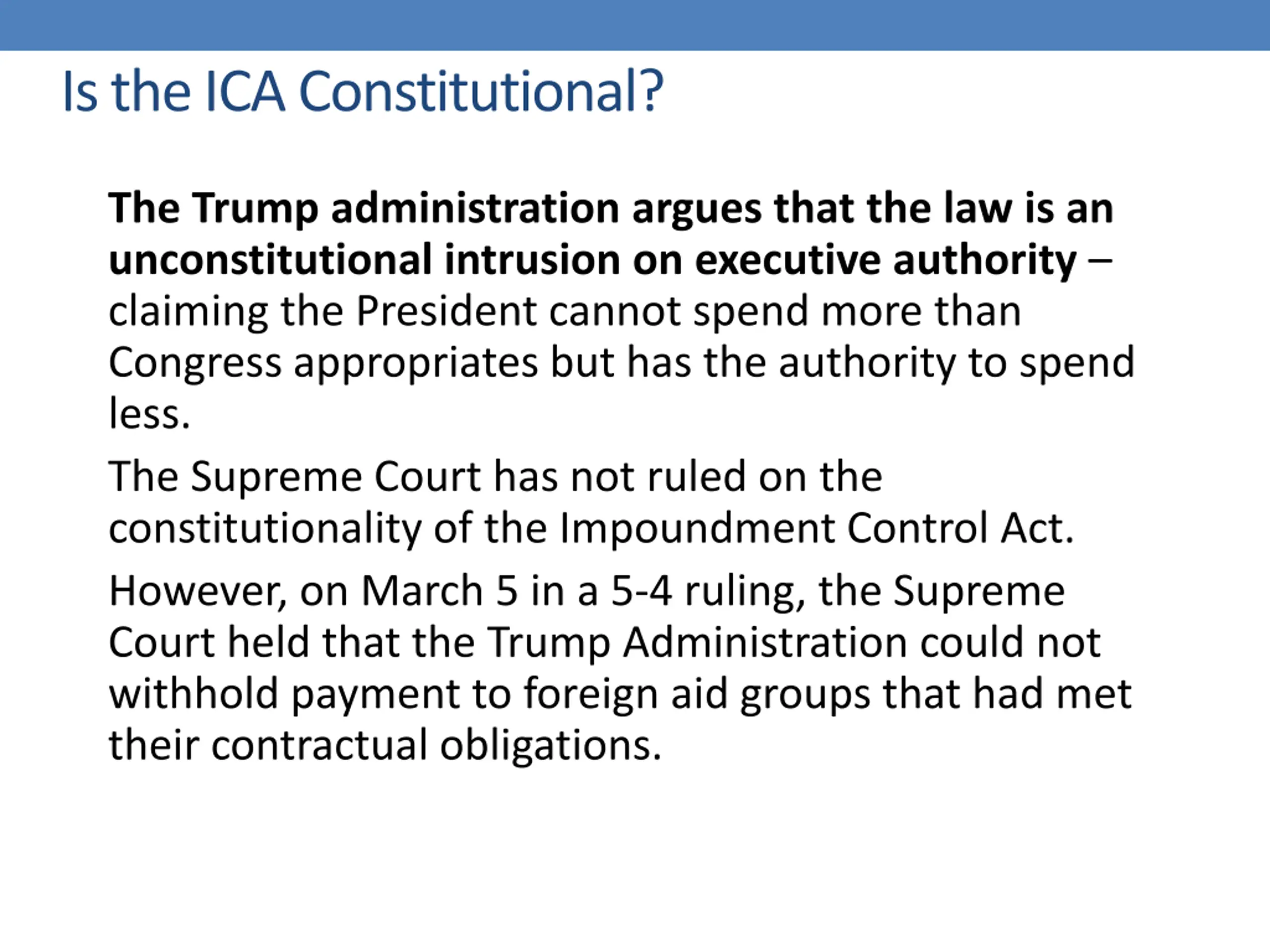 Is the ICA Constitutional? The Trump administration argues that the law is an unconstitutional intrusion on executive authority claiming the President cannot spend more than Congress appropriates but has the authority to spend less. The Supreme Court has not ruled on the constitutionality of the Impoundment Control Act. However, on March 5 in a 5-4 ruling, the Supreme Court held that the Trump Administration could not withhold payment to foreign aid groups that had met their contractual obligations.