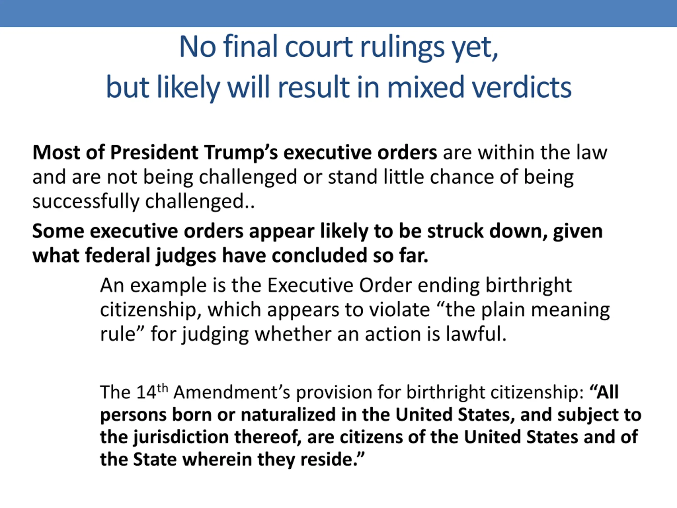 No final court rulings yet, but likely will result in mixed verdicts Most of President Trump s executive orders are within the law and are not being challenged or stand little chance of being successfully challenged.. Some executive orders appear likely to be struck down, given what federal judges have concluded so far. An example is the Executive Order ending birthright citizenship, which appears to violate the plain meaning rule for judging whether an action is lawful. The 14thAmendment s provision for birthright citizenship: All persons born or naturalized in the United States, and subject to the jurisdiction thereof, are citizens of the United States and of the State wherein they reside.