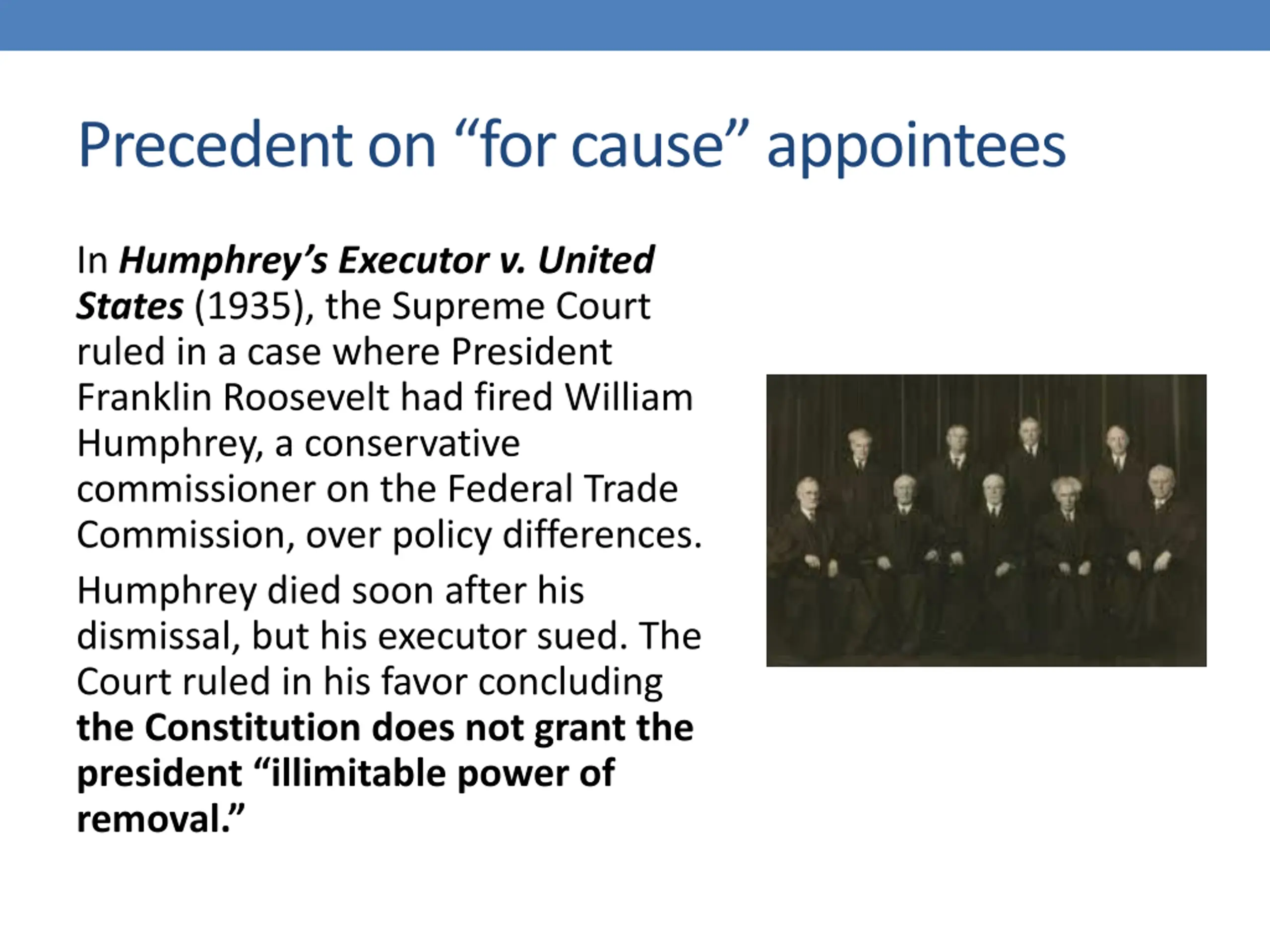 Precedent on for cause appointees In Humphrey s Executor v. United States (1935), the Supreme Court ruled in a case where President Franklin Roosevelt had fired William Humphrey, a conservative commissioner on the Federal Trade Commission, over policy differences. Humphrey died soon after his dismissal, but his executor sued. The Court ruled in his favor concluding the Constitution does not grant the president illimitable power of removal.