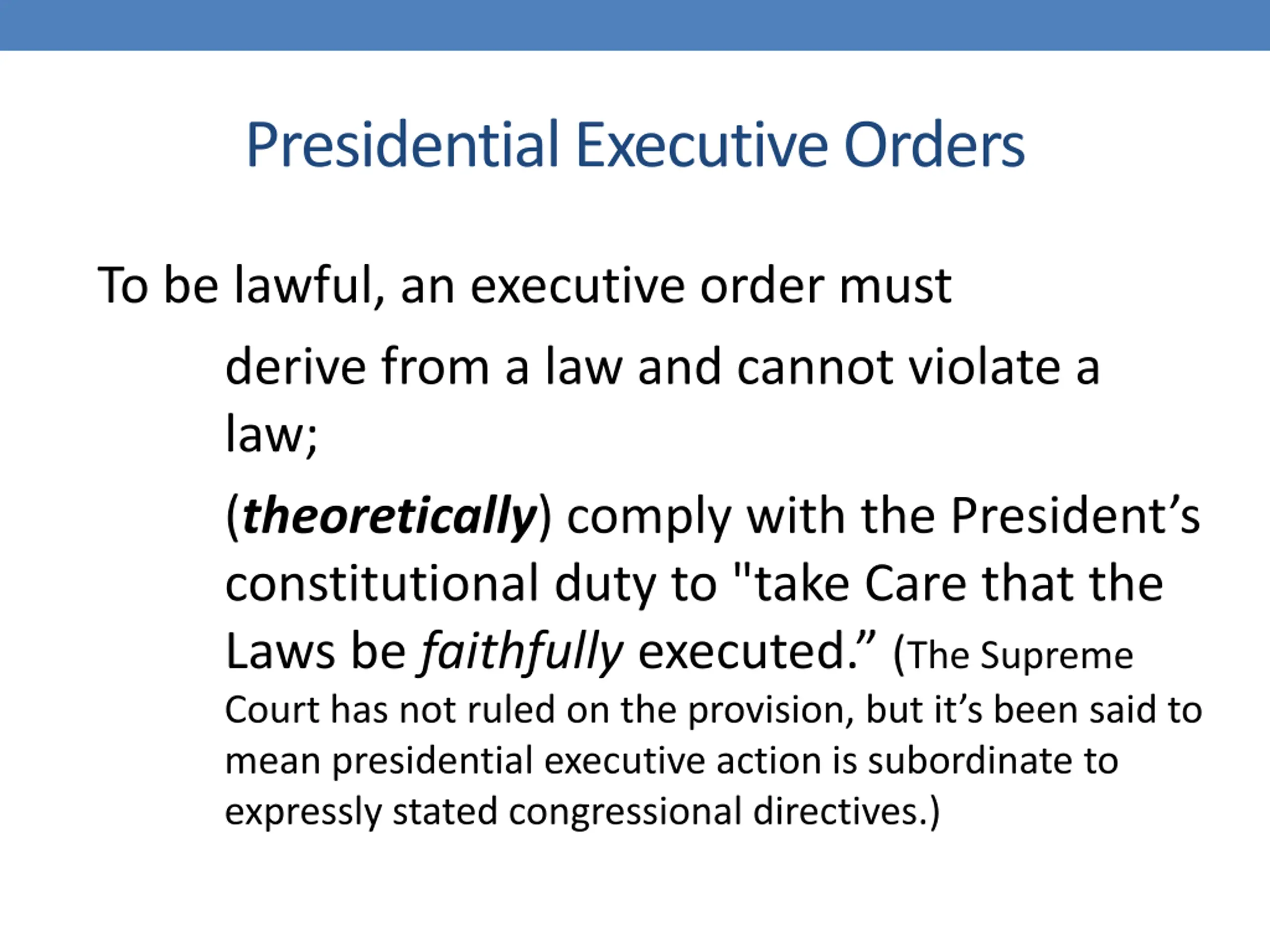 Presidential Executive Orders To be lawful, an executive order must derive from a law and cannot violate a law; (theoretically) comply with the President s constitutional duty to "take Care that the Laws be faithfullyexecuted. (The Supreme Court has not ruled on the provision, but it s been said to mean presidential executive action is subordinate to expressly stated congressional directives.)