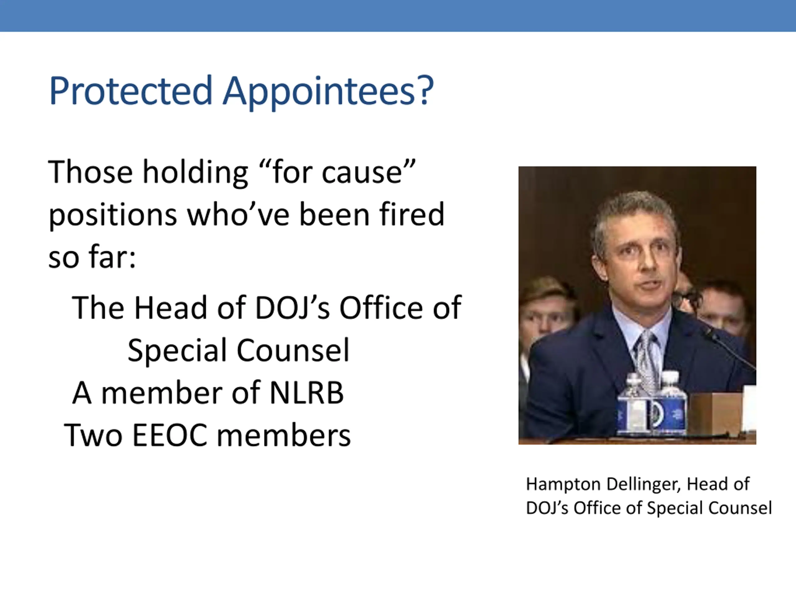 Protected Appointees? Those holding for cause positions who ve been fired so far: The Head of DOJ s Office of Special Counsel A member of NLRB Two EEOC members Hampton Dellinger, Head of DOJ s Office of Special Counsel