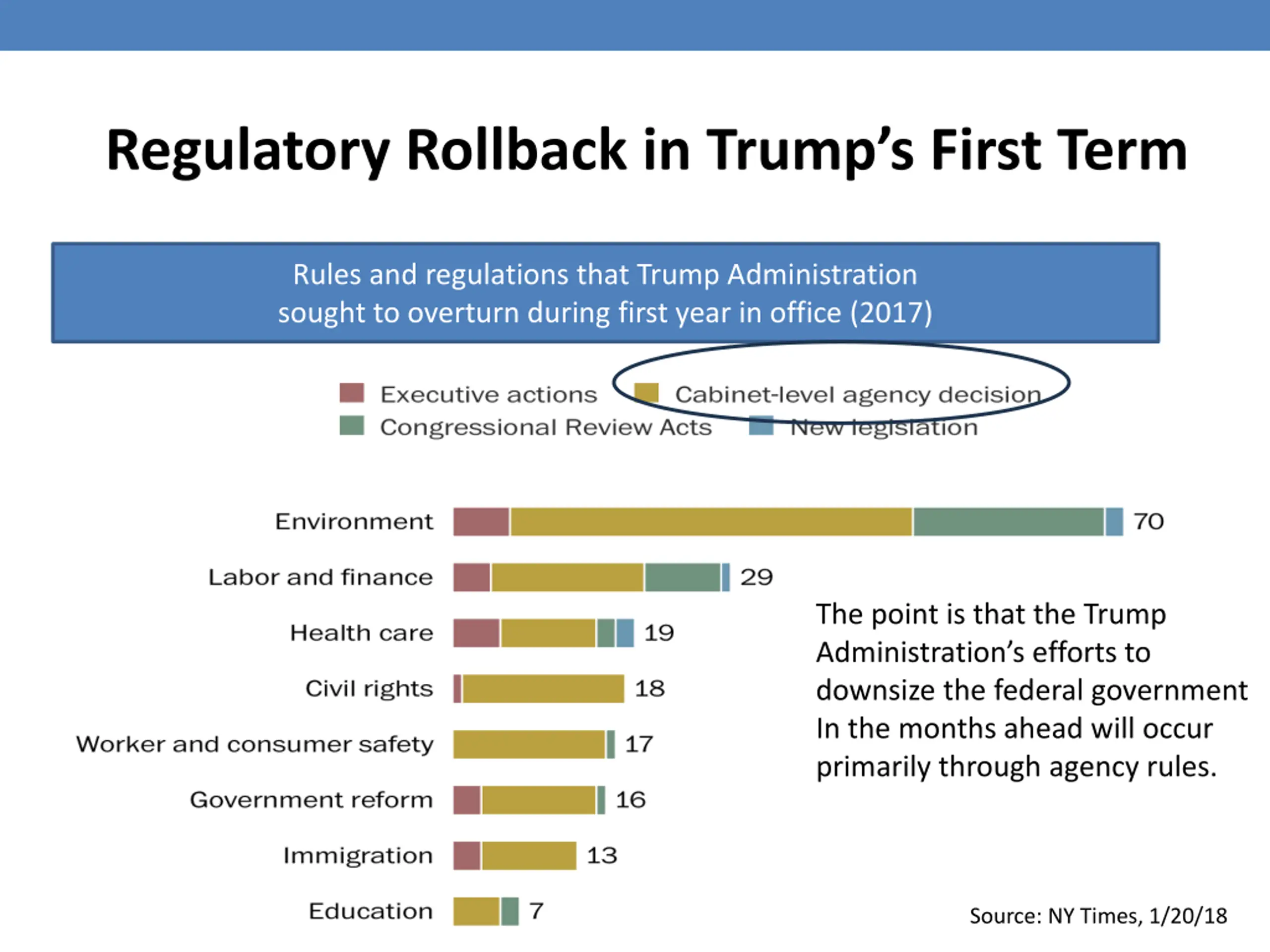 Regulatory Rollback in Trumps First Term Rules and regulations that Trump Administration sought to overturn during first year in office (2017) The point is that the Trump Administration s efforts to downsize the federal government In the months ahead will occur primarily through agency rules. Source: NY Times, 1/20/18