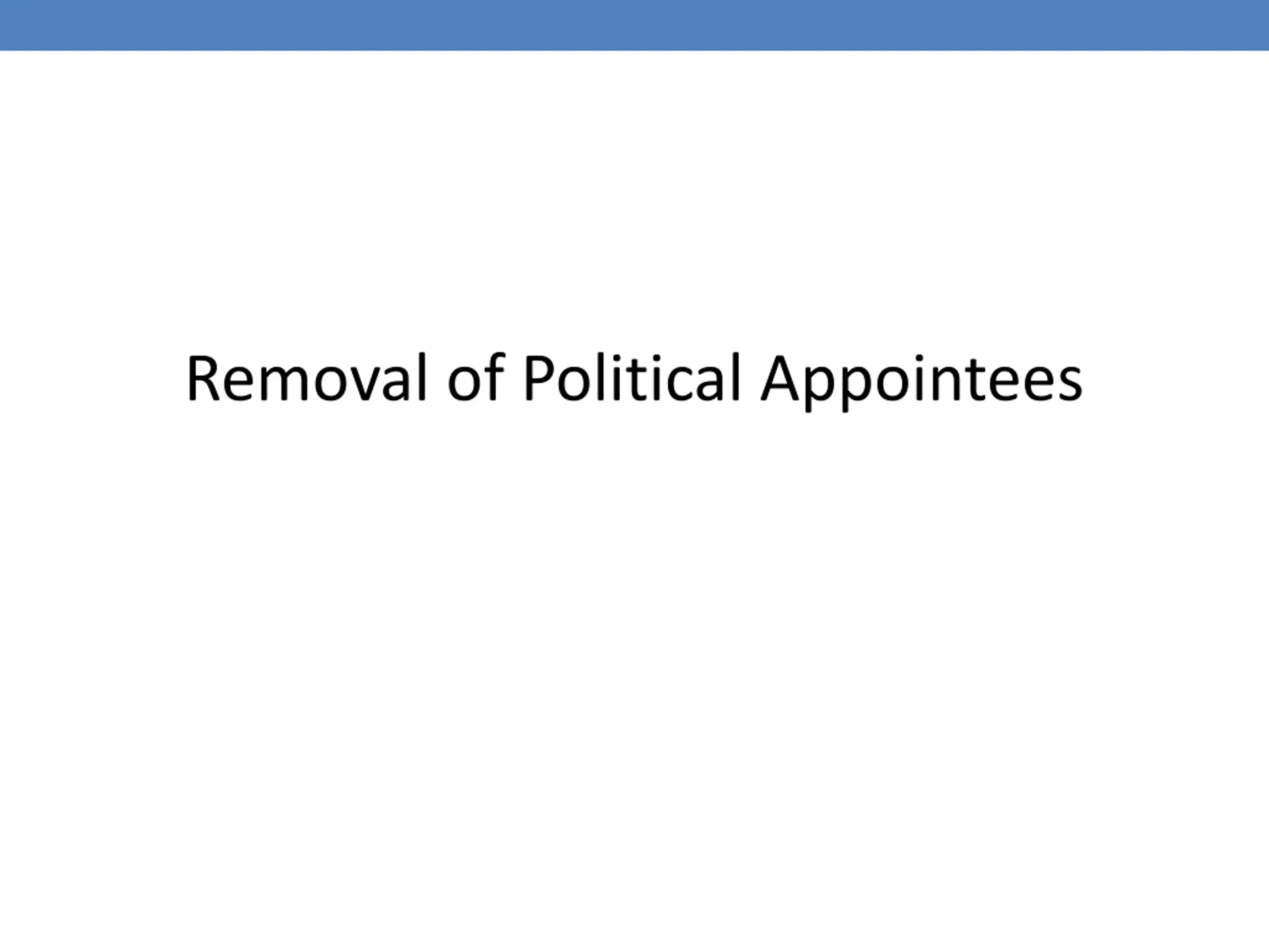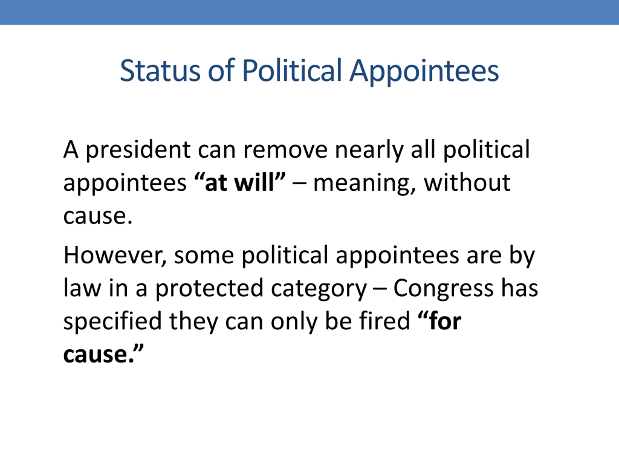 Status of Political Appointees A president can remove nearly all political appointees at will meaning, without cause. However, some political appointees are by law in a protected category Congress has specified they can only be fired for cause.