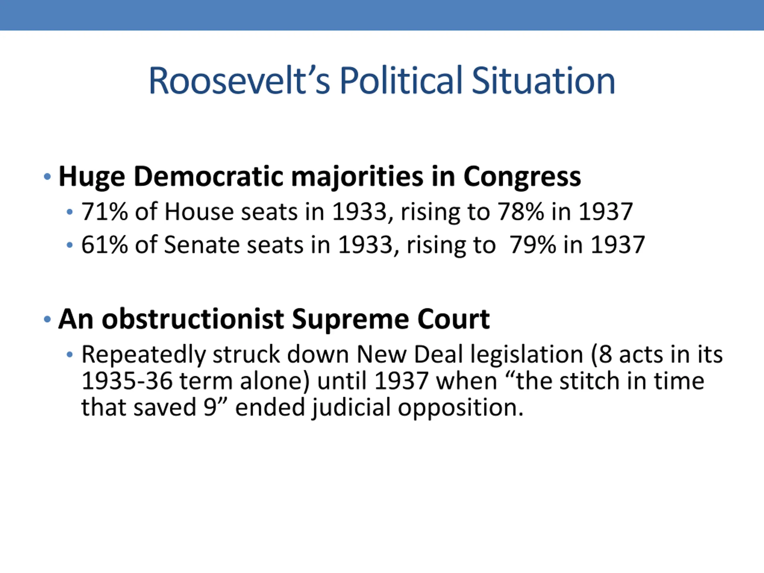 Roosevelts Political Situation Huge Democratic majorities in Congress 71% of House seats in 1933, rising to 78% in 1937 61% of Senate seats in 1933, rising to 79% in 1937 An obstructionist Supreme Court Repeatedly struck down New Deal legislation (8 acts in its 1935-36 term alone) until 1937 when the stitch in time that saved 9 ended judicial opposition.