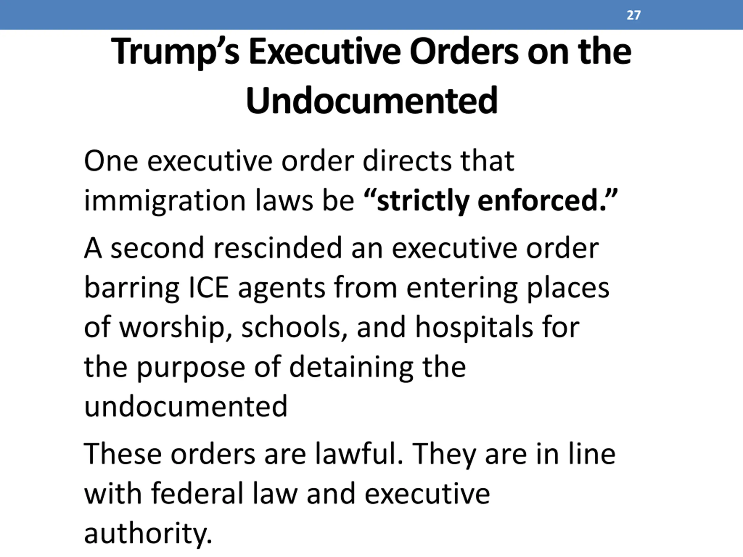 27 Trump s Executive Orders on the Undocumented One executive order directs that immigration laws be strictly enforced. A second rescinded an executive order barring ICE agents from entering places of worship, schools, and hospitals for the purpose of detaining the undocumented These orders are lawful. They are in line with federal law and executive authority.