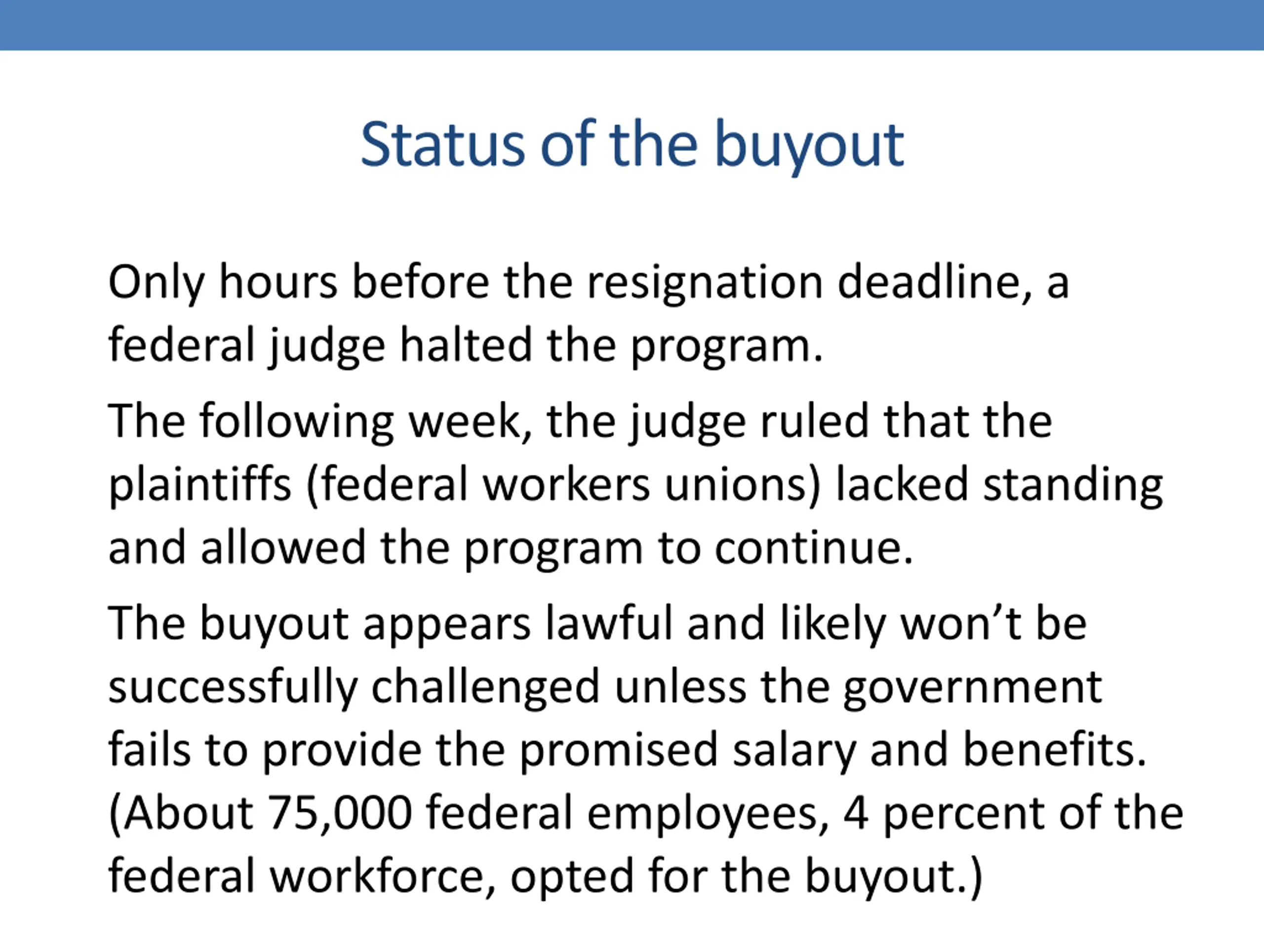 Status of the buyout Only hours before the resignation deadline, a federal judge halted the program. The following week, the judge ruled that the plaintiffs (federal workers unions) lacked standing and allowed the program to continue. The buyout appears lawful and likely won t be successfully challenged unless the government fails to provide the promised salary and benefits. (About 75,000 federal employees, 4 percent of the federal workforce, opted for the buyout.)