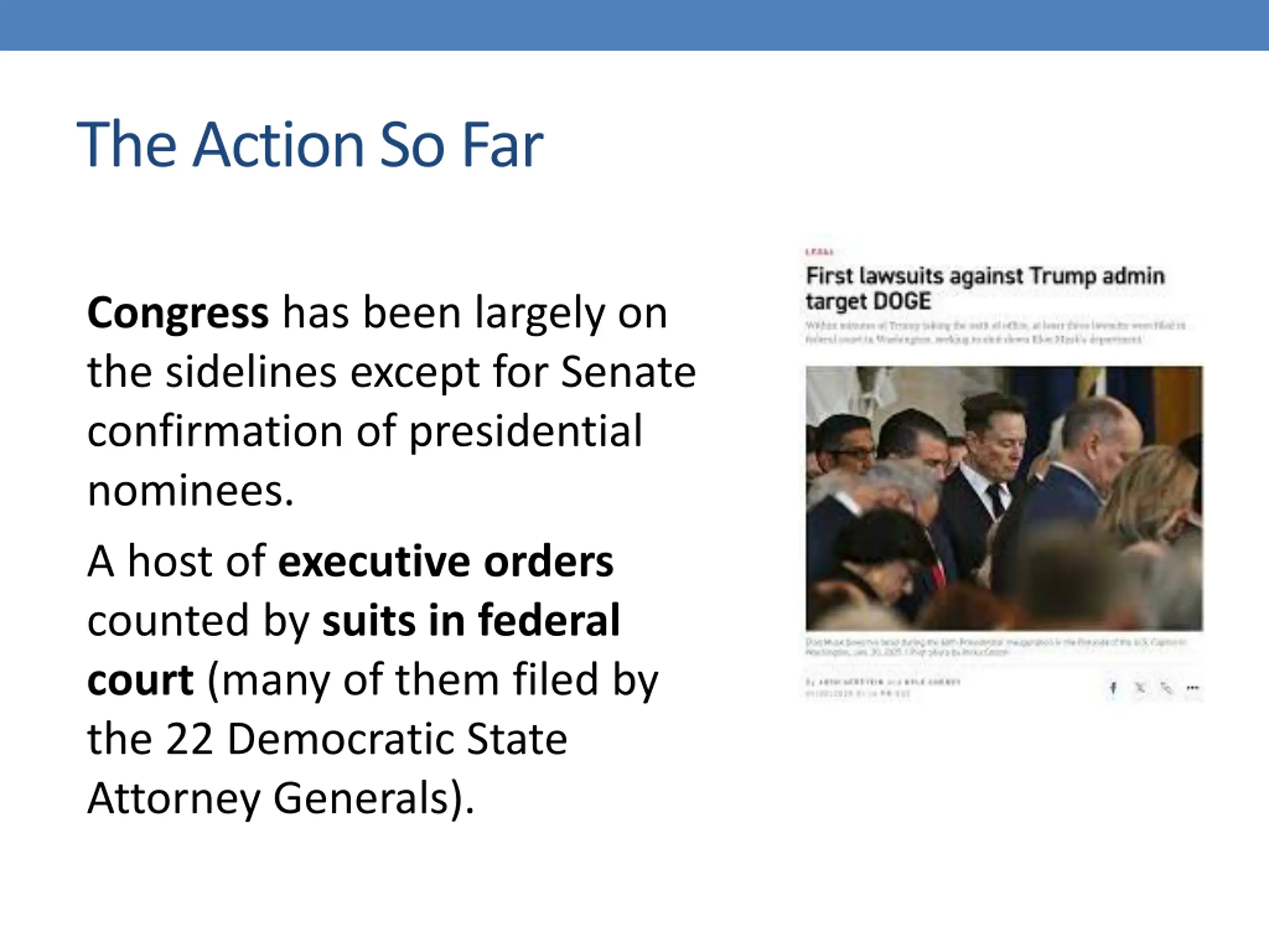 The Action So Far Congress has been largely on the sidelines except for Senate confirmation of presidential nominees. A host of executive orders counted by suits in federal court (many of them filed by the 22 Democratic State Attorney Generals).