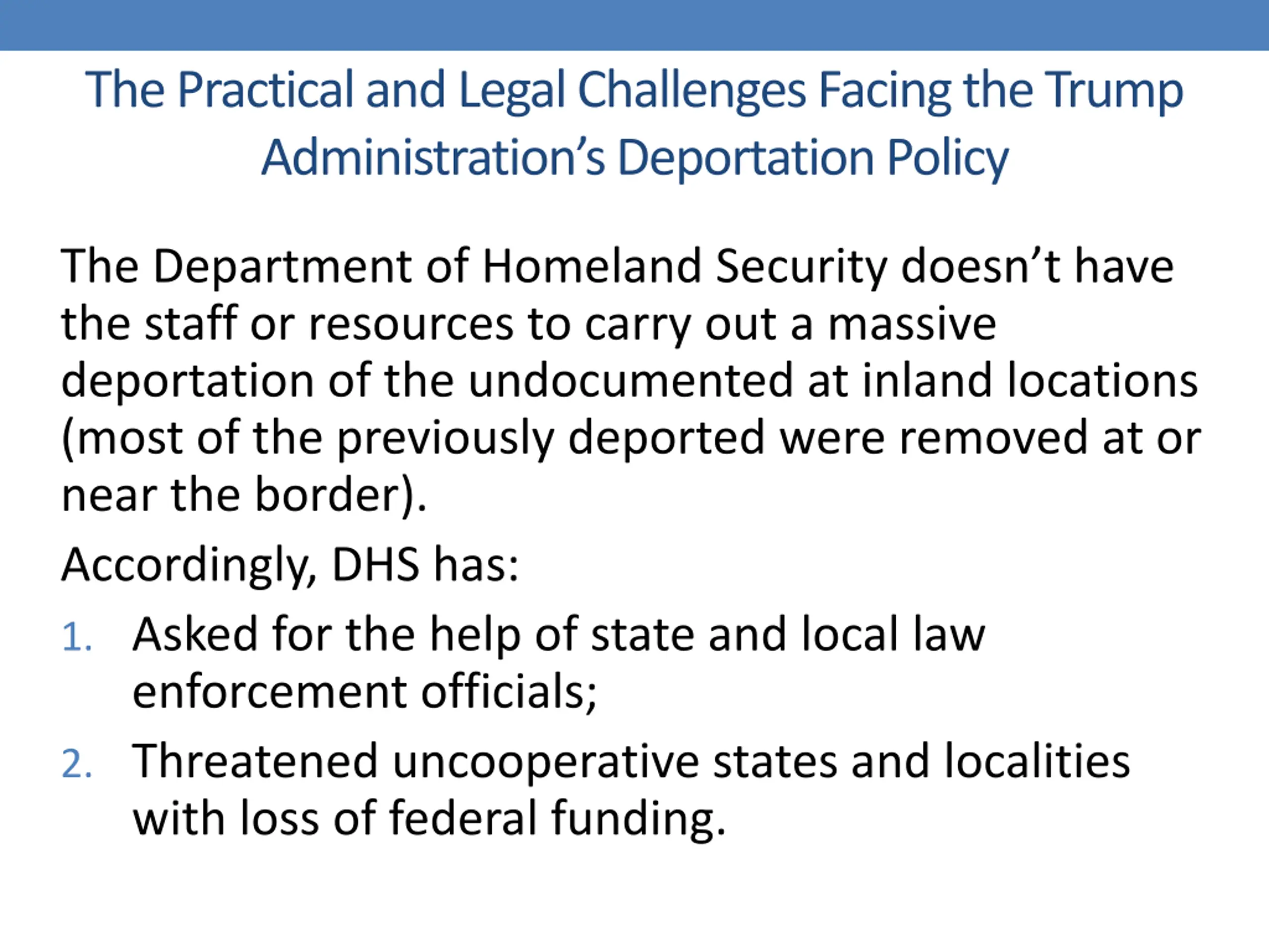 The Practical and Legal Challenges Facing the Trump Administration s Deportation Policy The Department of Homeland Security doesn t have the staff or resources to carry out a massive deportation of the undocumented at inland locations (most of the previously deported were removed at or near the border). Accordingly, DHS has: 1. Asked for the help of state and local law enforcement officials; 2. Threatened uncooperative states and localities with loss of federal funding.