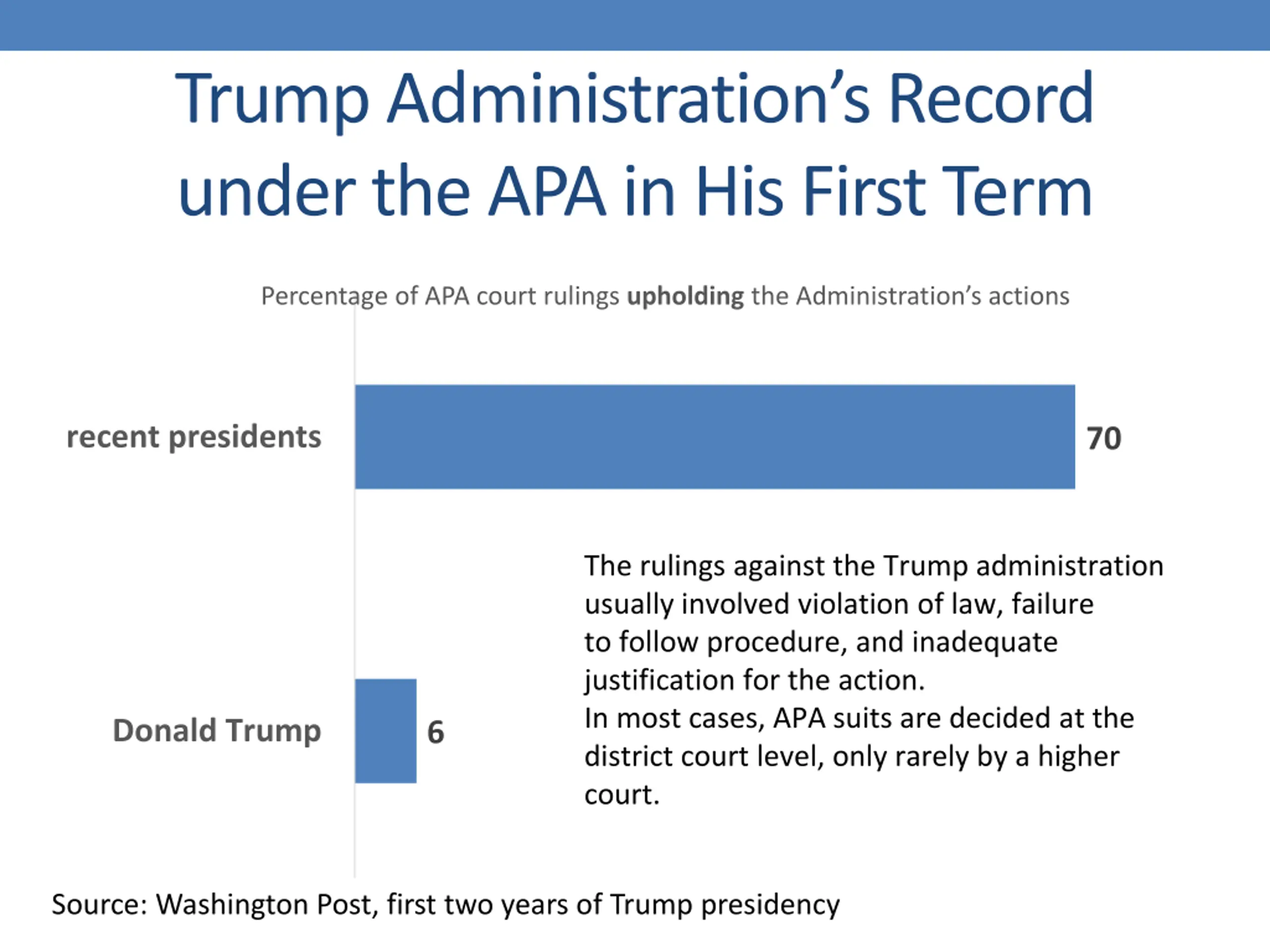 Trump Administrations Record under the APA in His First Term Percentage of APA court rulings upholdingthe Administration s actions recent presidents 70 The rulings against the Trump administration usually involved violation of law, failure to follow procedure, and inadequate justification for the action. In most cases, APA suits are decided at the district court level, only rarely by a higher court. Donald Trump 6 Source: Washington Post, first two years of Trump presidency