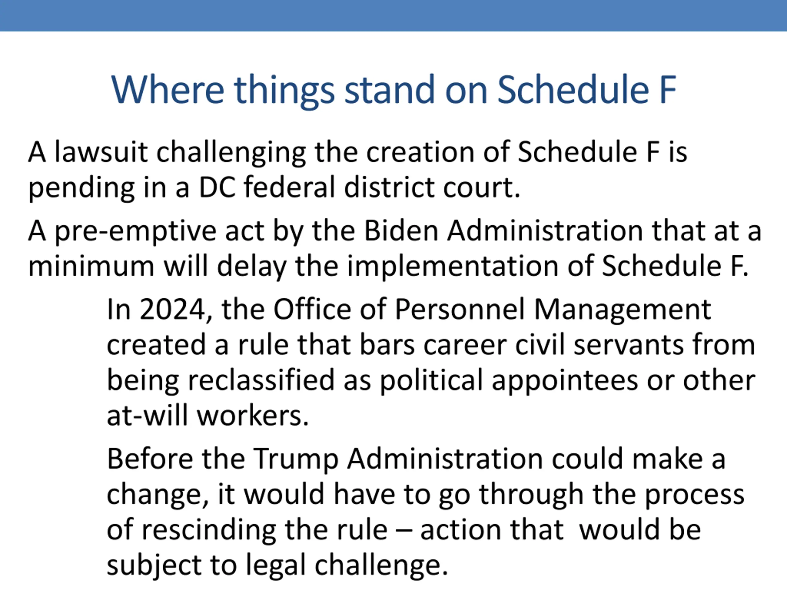 Where things stand on Schedule F A lawsuit challenging the creation of Schedule F is pending in a DC federal district court. A pre-emptive act by the Biden Administration that at a minimum will delay the implementation of Schedule F. In 2024, the Office of Personnel Management created a rule that bars career civil servants from being reclassified as political appointees or other at-will workers. Before the Trump Administration could make a change, it would have to go through the process of rescinding the rule action that would be subject to legal challenge.