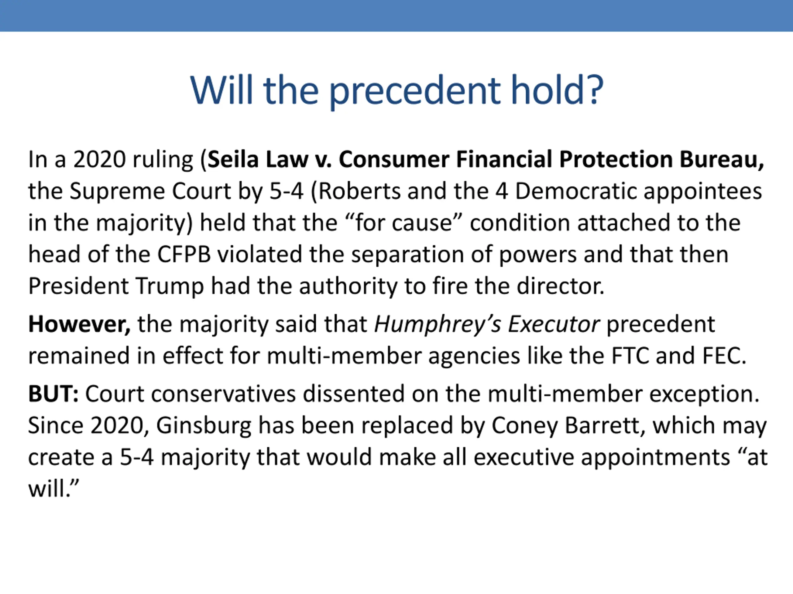 Will the precedent hold? In a 2020 ruling (Seila Law v. Consumer Financial Protection Bureau, the Supreme Court by 5-4 (Roberts and the 4 Democratic appointees in the majority) held that the for cause condition attached to the head of the CFPB violated the separation of powers and that then President Trump had the authority to fire the director. However, the majority said that Humphrey s Executor precedent remained in effect for multi-member agencies like the FTC and FEC. BUT: Court conservatives dissented on the multi-member exception. Since 2020, Ginsburg has been replaced by Coney Barrett, which may create a 5-4 majority that would make all executive appointments at will.