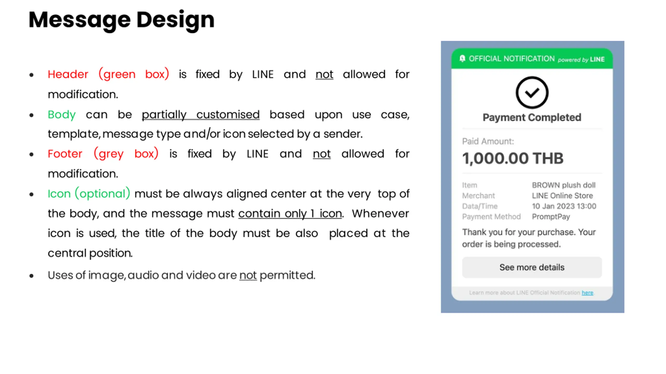 Message Design Header (green box) is fixed by LINE and not allowed for modification. Body can be partially customised based upon use case, template,message type and/oriconselected by a sender. Footer (grey box) is fixed by modification. Icon (optional) must be always aligned center at the very top of the body, and the message must contain only 1 icon. Whenever icon is used, the title of the body must be also central position. LINE and not allowed for 12 placed at the Usesofimage,audio and videoare not permitted.