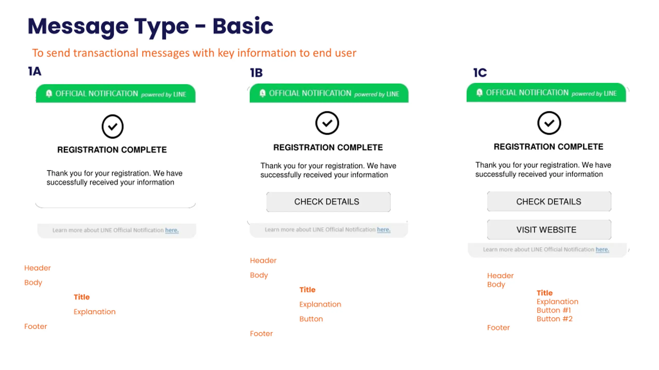 Message Type - Basic To send transactional messages with key information to end user 1A 1B 1C REGISTRATION COMPLETE REGISTRATION COMPLETE REGISTRATION COMPLETE Thank you for your registration. We have successfully received your information Thank you for your registration. We have successfully received your information Thank you for your registration. We have successfully received your information CHECK DETAILS CHECK DETAILS VISIT WEBSITE Header Header Body Header Body Footer Body Title Title Explanation Button #1 Button #2 Title Explanation Explanation Button Footer Footer