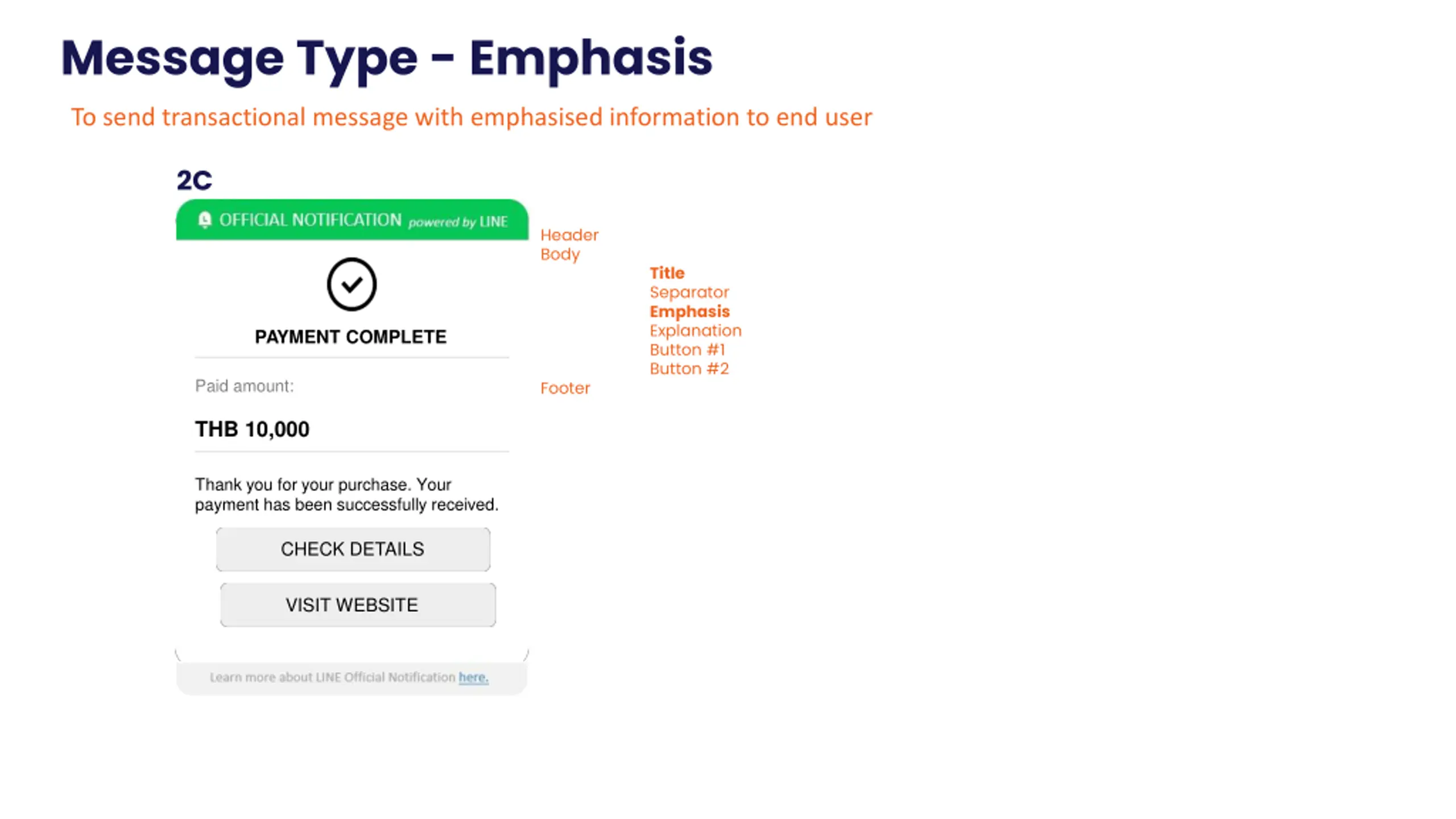 Message Type - Emphasis To send transactional message with emphasised information to end user 2C Header Body Footer Title Separator Emphasis Explanation Button #1 Button #2 PAYMENT COMPLETE Paid amount: THB 10,000 Thank you for your purchase. Your payment has been successfully received. CHECK DETAILS VISIT WEBSITE