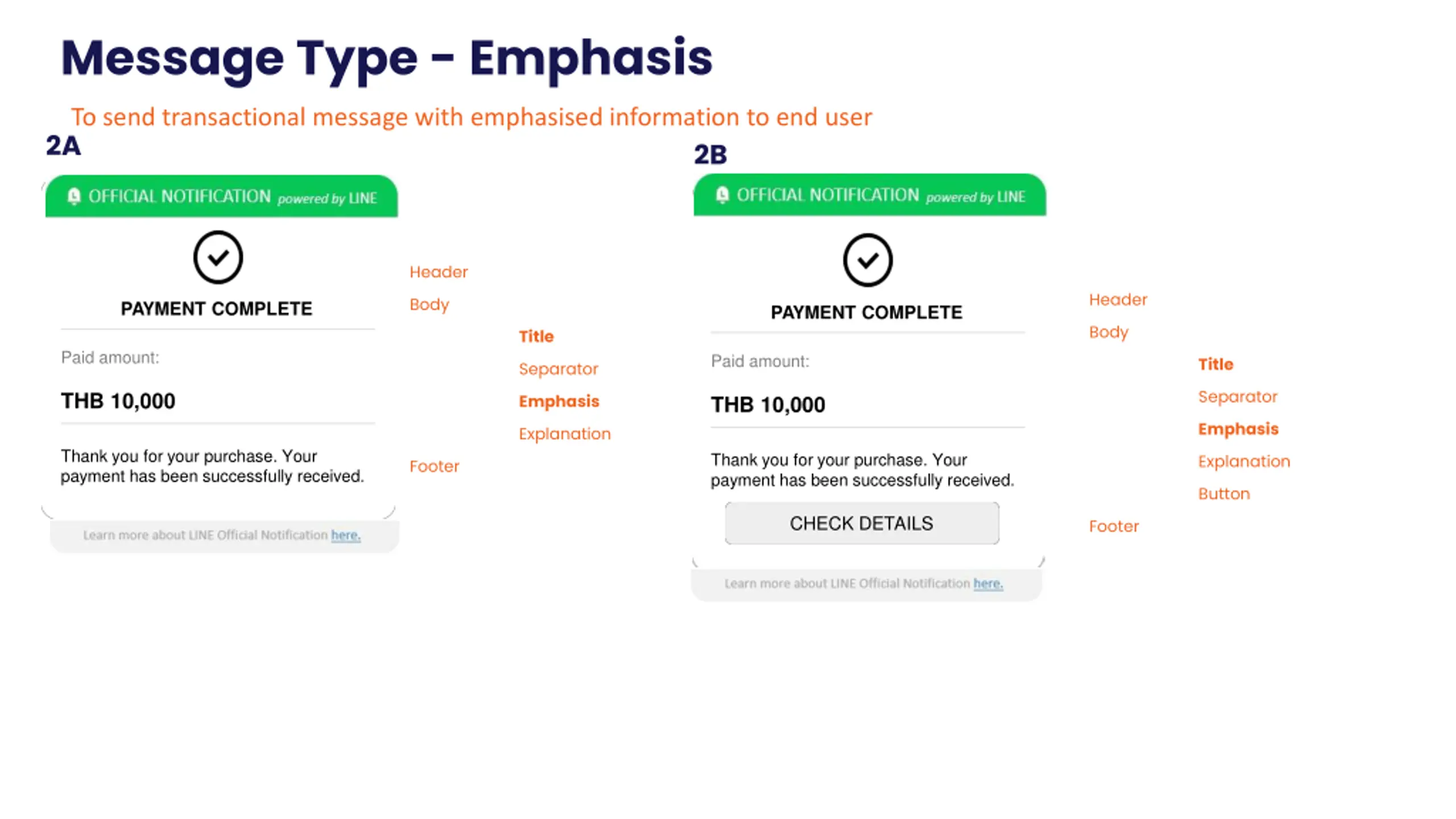 Message Type - Emphasis To send transactional message with emphasised information to end user 2A 2B Header Header Body PAYMENT COMPLETE PAYMENT COMPLETE Body Title Paid amount: Paid amount: Title Separator Separator THB 10,000 Emphasis THB 10,000 Emphasis Explanation Thank you for your purchase. Your payment has been successfully received. Thank you for your purchase. Your payment has been successfully received. Explanation Footer Button CHECK DETAILS Footer