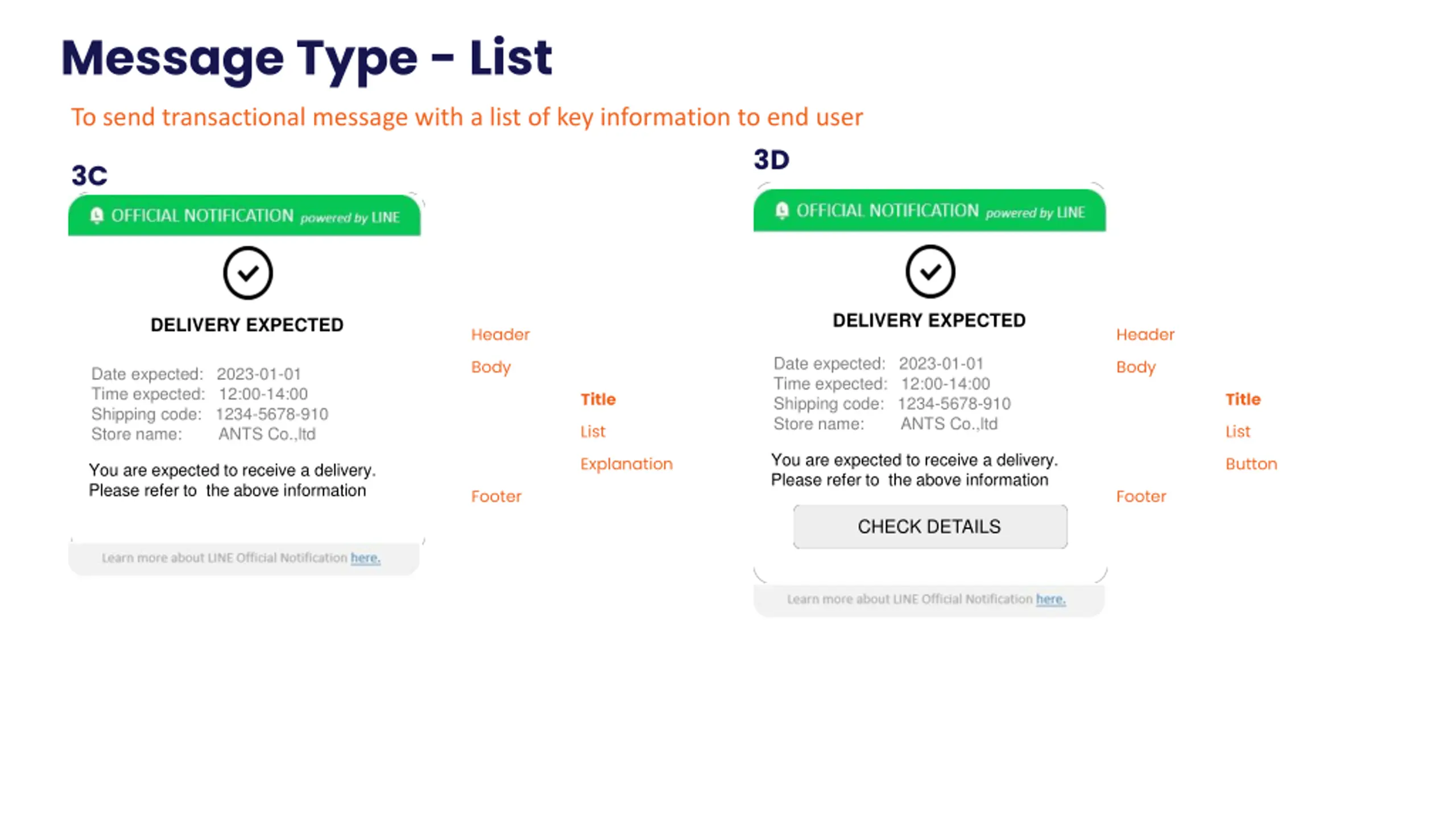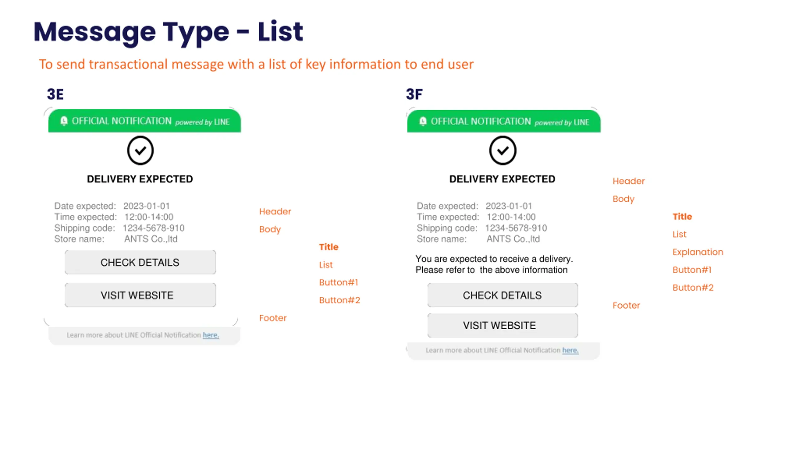 Message Type - List To send transactional message with a list of key information to end user 3E 3F DELIVERY EXPECTED DELIVERY EXPECTED Header Body Date expected: 2023-01-01 Time expected: 12:00-14:00 Shipping code: 1234-5678-910 Store name: ANTS Co.,ltd Date expected: 2023-01-01 Time expected: 12:00-14:00 Shipping code: 1234-5678-910 Store name: ANTS Co.,ltd Header Title Body List Title Explanation You are expected to receive a delivery. Please refer to the above information CHECK DETAILS List Button#1 Button#1 Button#2 VISIT WEBSITE CHECK DETAILS Button#2 Footer Footer VISIT WEBSITE