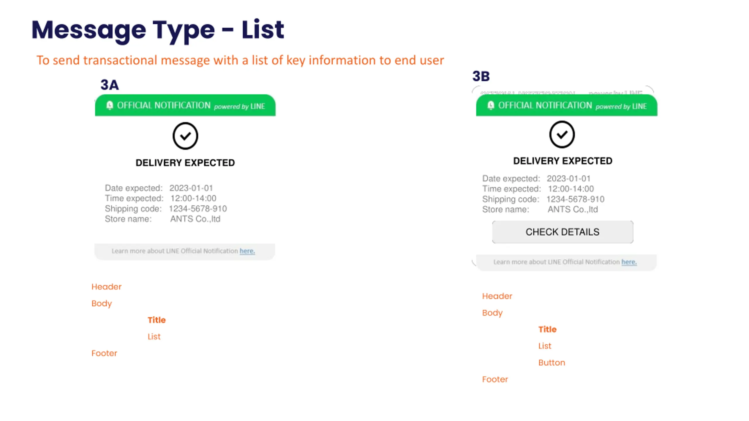 Message Type - List To send transactional message with a list of key information to end user 3B 3A DELIVERY EXPECTED DELIVERY EXPECTED Date expected: 2023-01-01 Time expected: 12:00-14:00 Shipping code: 1234-5678-910 Store name: ANTS Co.,ltd Date expected: 2023-01-01 Time expected: 12:00-14:00 Shipping code: 1234-5678-910 Store name: ANTS Co.,ltd CHECK DETAILS Header Header Body Body Title Title List List Footer Button Footer
