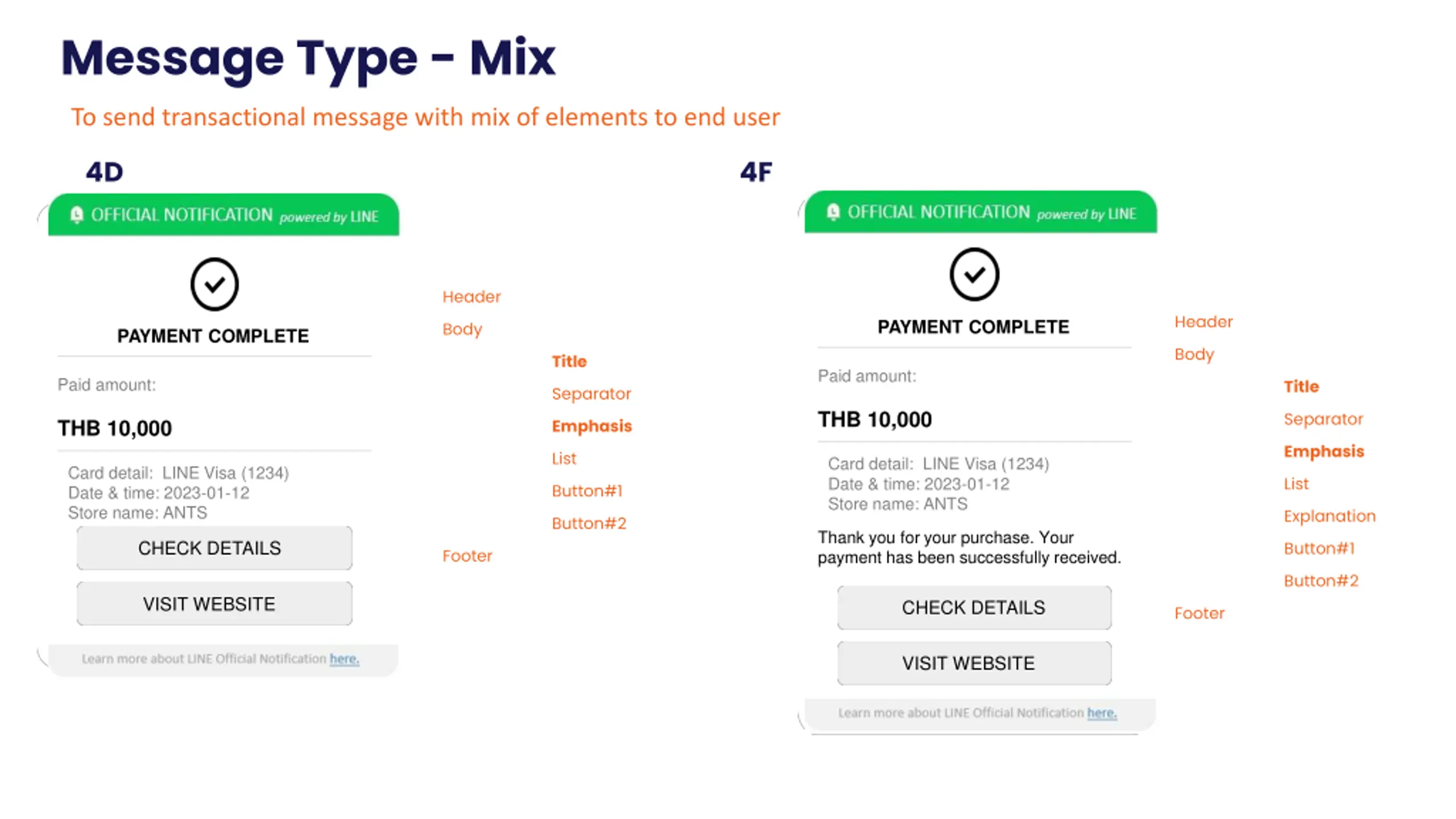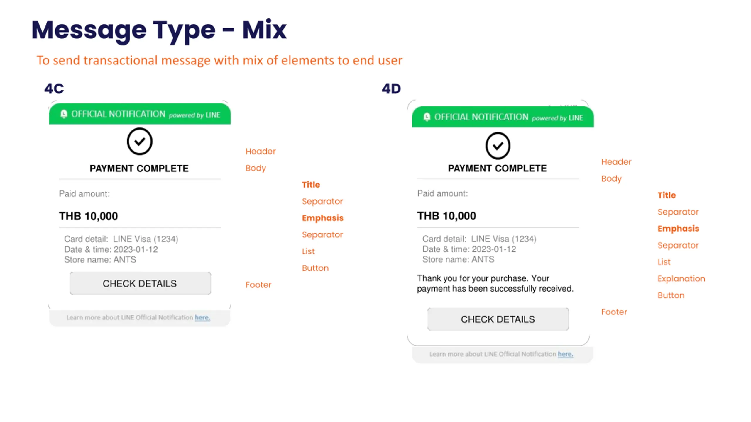 Message Type - Mix To send transactional message with mix of elements to end user 4D 4F Header Header PAYMENT COMPLETE Body PAYMENT COMPLETE Body Title Paid amount: Paid amount: Title Separator THB 10,000 Separator Emphasis THB 10,000 Emphasis List Card detail: LINE Visa (1234) Date & time: 2023-01-12 Store name: ANTS Card detail: LINE Visa (1234) Date & time: 2023-01-12 Store name: ANTS List Button#1 Explanation Button#2 Thank you for your purchase. Your payment has been successfully received. CHECK DETAILS Button#1 Footer Button#2 VISIT WEBSITE CHECK DETAILS Footer VISIT WEBSITE