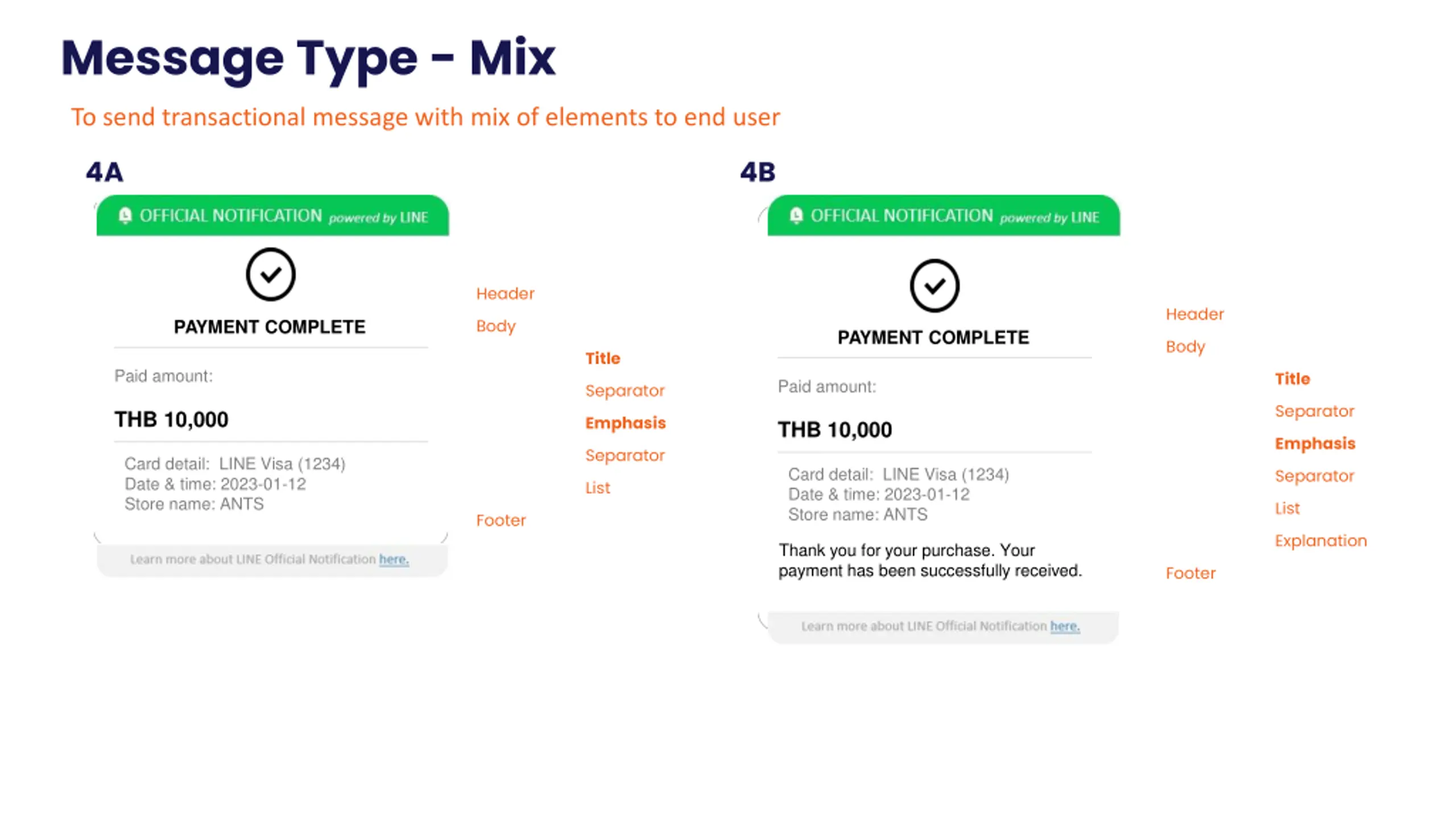 Message Type - Mix To send transactional message with mix of elements to end user 4A 4B Header Header Body PAYMENT COMPLETE PAYMENT COMPLETE Body Title Paid amount: Title Paid amount: Separator Separator THB 10,000 Emphasis THB 10,000 Emphasis Separator Card detail: LINE Visa (1234) Date & time: 2023-01-12 Store name: ANTS Card detail: LINE Visa (1234) Date & time: 2023-01-12 Store name: ANTS Separator List List Footer Explanation Thank you for your purchase. Your payment has been successfully received. Footer