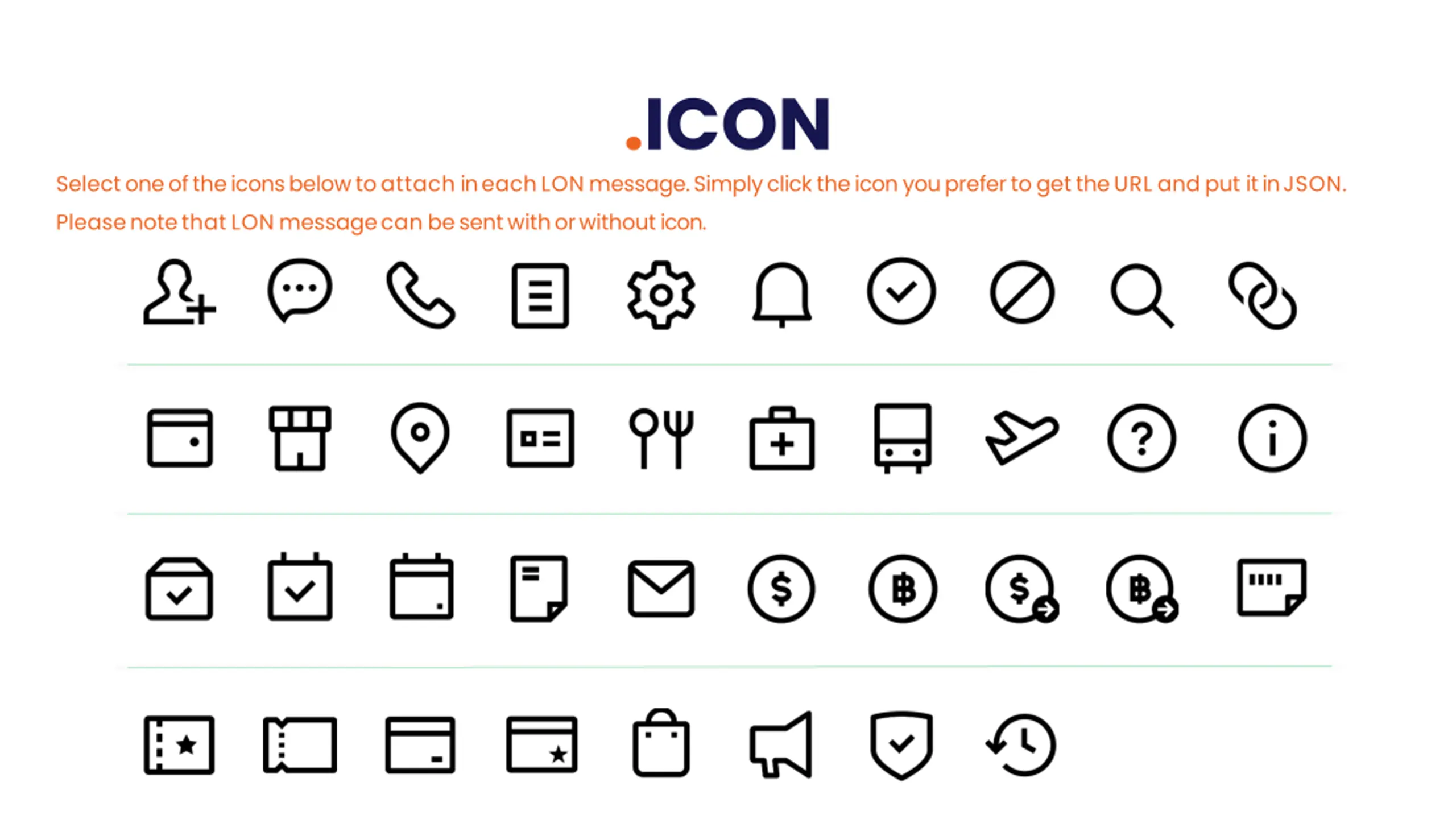 .ICON Selectoneoftheiconsbelowtoattach ineach LON message.Simplyclicktheiconyouprefertoget theURL and put itinJSON. Pleasenotethat LON messagecan besentwithorwithouticon.