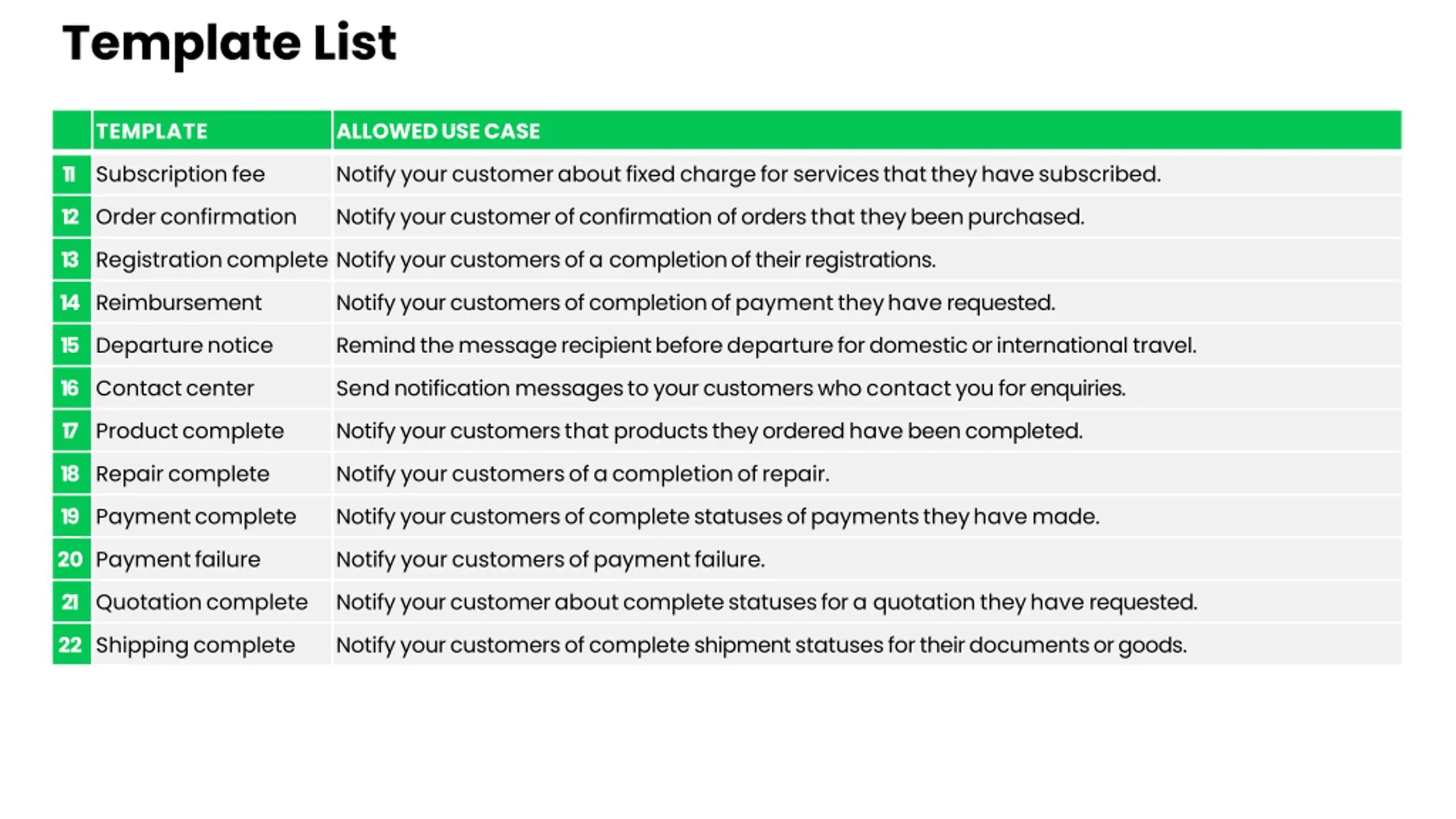 Template List TEMPLATE ALLOWEDUSECASE 11 Subscriptionfee Notify yourcustomerabout fixed chargefor servicesthattheyhavesubscribed. 12 Orderconfirmation Notifyyourcustomerofconfirmation ofordersthat theybeenpurchased. 13 Registrationcomplete Notifyyourcustomersofa completionoftheirregistrations. 14 Reimbursement Notifyyourcustomersofcompletionofpaymenttheyhave requested. 15 Departurenotice Remindthemessagerecipientbeforedeparturefordomesticorinternational travel. 16 Contactcenter Sendnotification messagestoyourcustomerswho contactyouforenquiries. 17 Productcomplete Notifyyourcustomersthat productstheyorderedhave beencompleted. 18 Repaircomplete Notify yourcustomersof acompletionofrepair. 19 Paymentcomplete Notifyyourcustomersofcompletestatusesofpaymentstheyhave made. 20 Paymentfailure Notify yourcustomersof paymentfailure. 21 Quotationcomplete Notifyyourcustomeraboutcompletestatusesfora quotationtheyhave requested. 22 Shipping complete Notifyyourcustomersofcompleteshipmentstatusesfortheirdocumentsorgoods.