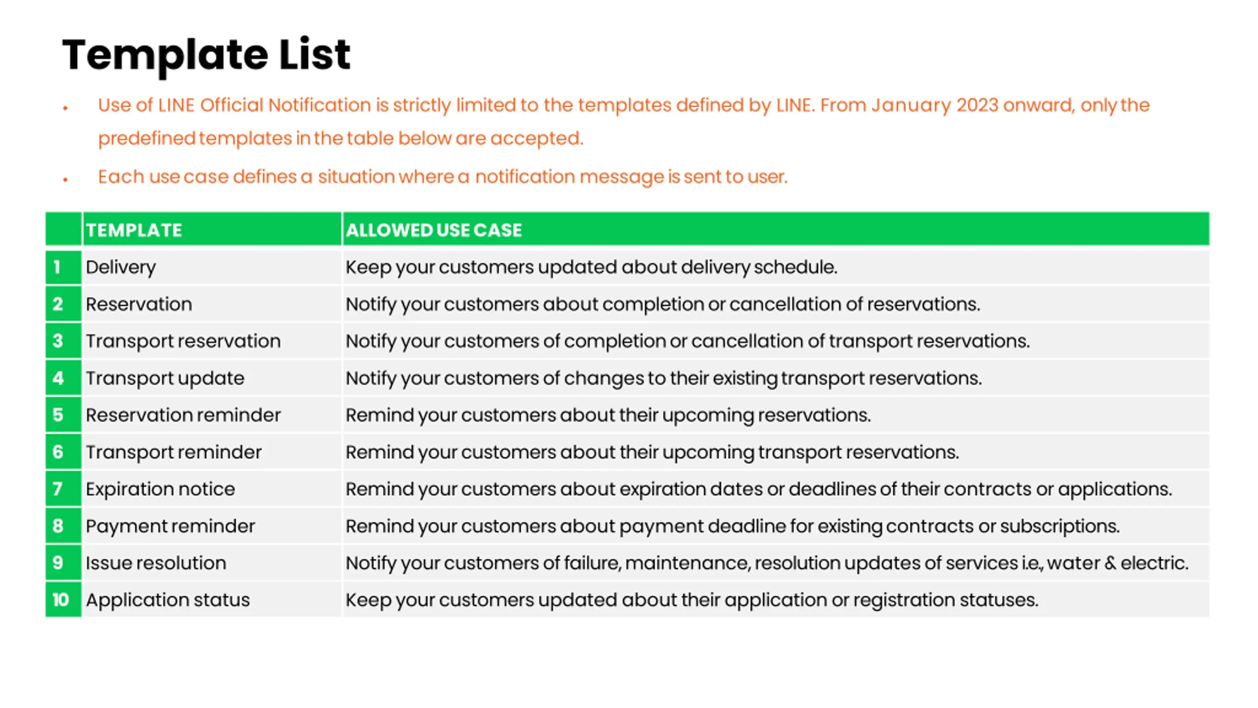 Template List Use of LINE Official Notification is strictly limited to the templates defined by LINE. From January 2023 onward, only the predefined templates in the table below are accepted. Each use case defines a situation where a notification message is sent to user. TEMPLATE ALLOWEDUSECASE 1 Delivery Keepyourcustomersupdated about deliveryschedule. 2 Reservation Notifyyourcustomersabout completionorcancellation ofreservations. 3 Transportreservation Notifyyourcustomersofcompletionorcancellation oftransportreservations. 4 Transportupdate Notifyyourcustomersofchangesto theirexistingtransportreservations. 5 Reservationreminder Remindyourcustomersabout theirupcomingreservations. 6 Transportreminder Remindyourcustomersabout theirupcomingtransportreservations. 7 Expirationnotice Remindyourcustomersabout expirationdates ordeadlinesoftheircontracts orapplications. 8 Paymentreminder Remindyourcustomersabout paymentdeadlineforexistingcontracts orsubscriptions. 9 Issueresolution Notifyyourcustomersoffailure,maintenance,resolutionupdatesofservicesi.e.,water & electric. 10 Application status Keepyourcustomersupdated about their application orregistration statuses.