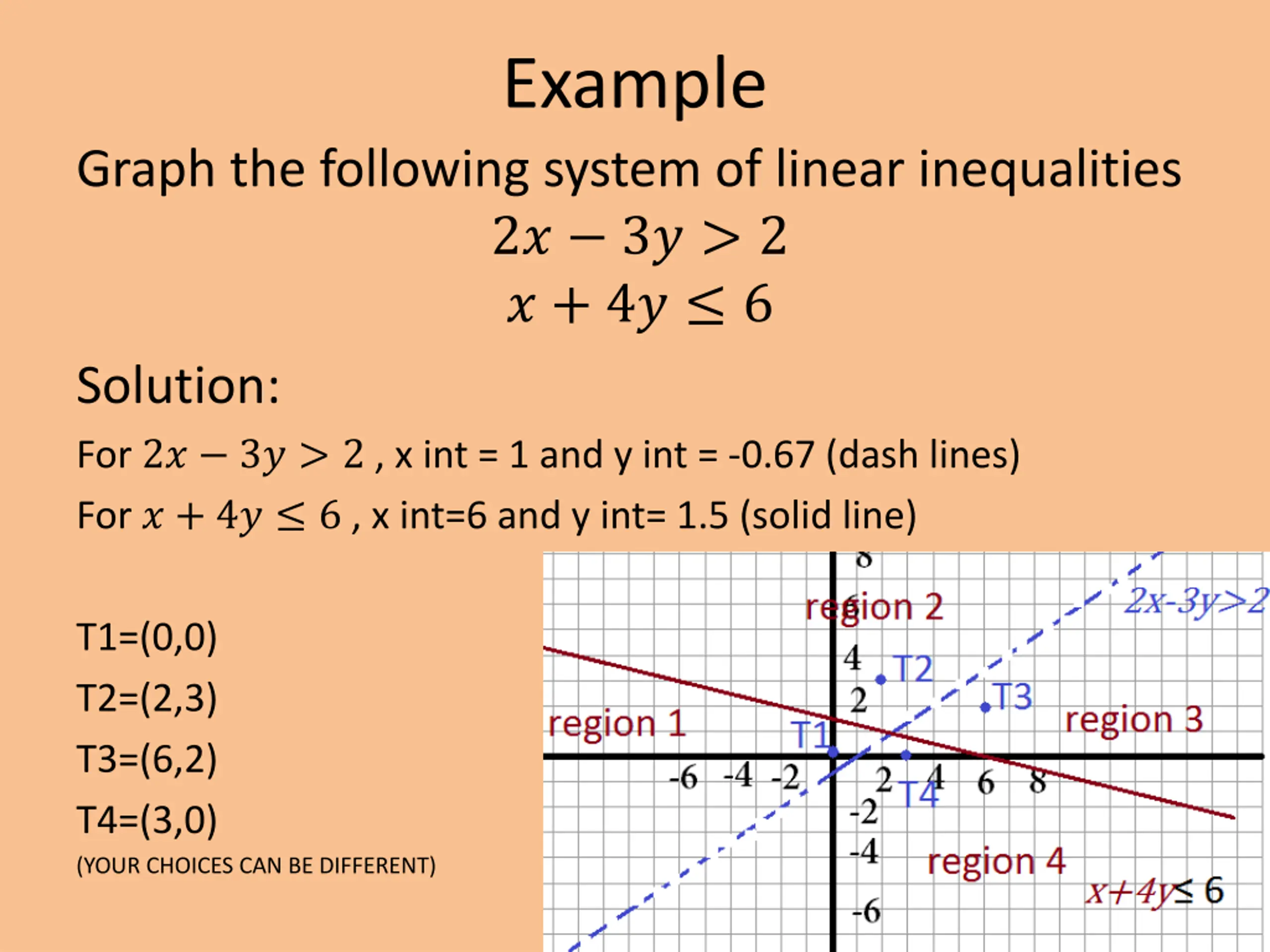 Example Graph the following system of linear inequalities 2? 3? > 2 ? + 4? 6 Solution: For 2? 3? > 2 , x int = 1 and y int = -0.67 (dash lines) For ? + 4? 6 , x int=6 and y int= 1.5 (solid line) T1=(0,0) T2=(2,3) T3=(6,2) T4=(3,0) (YOUR CHOICES CAN BE DIFFERENT)