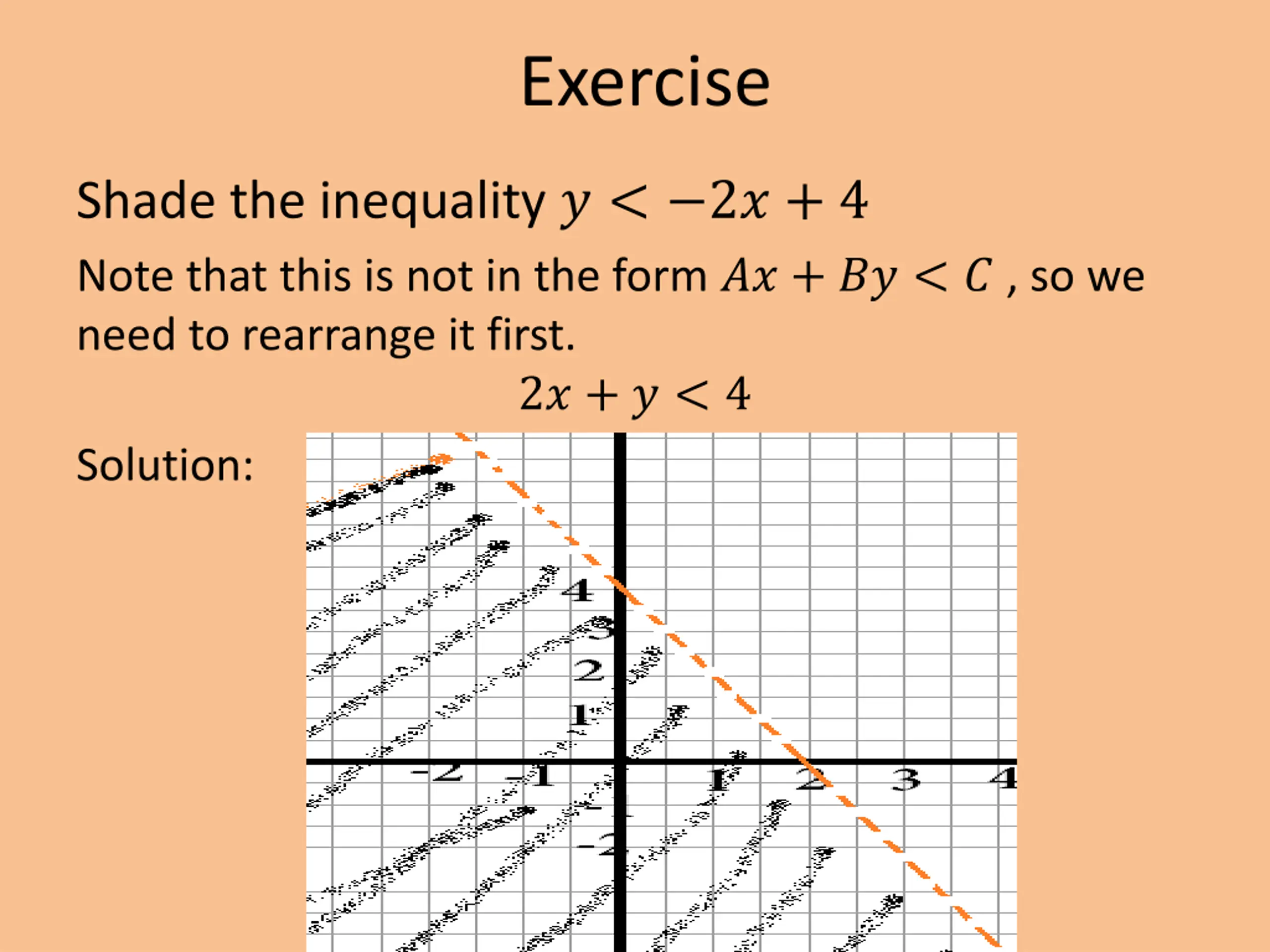 Exercise Shade the inequality ? < 2? + 4 Note that this is not in the form ?? + ?? < ? , so we need to rearrange it first. 2? + ? < 4 Solution: