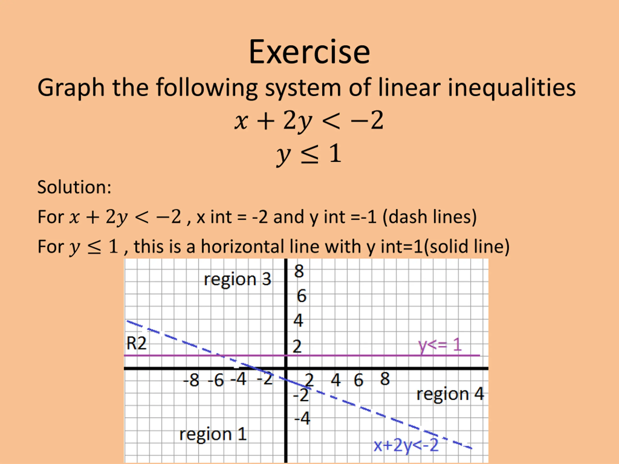 Exercise Graph the following system of linear inequalities ? + 2? < 2 ? 1 Solution: For ? + 2? < 2 , x int = -2 and y int =-1 (dash lines) For ? 1 , this is a horizontal line with y int=1(solid line)