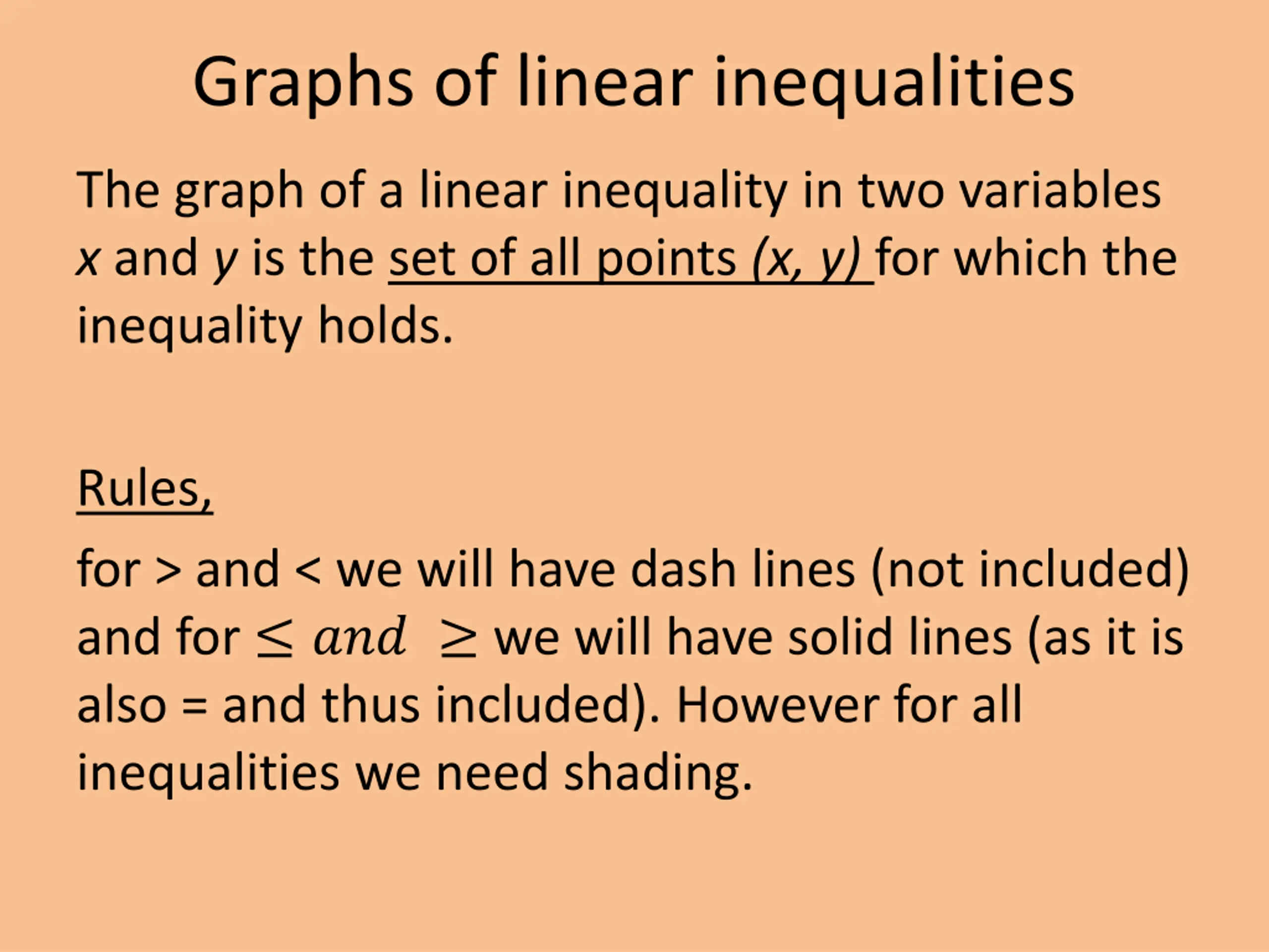 Graphs of linear inequalities The graph of a linear inequality in two variables x and y is the set of all points (x, y) for which the inequality holds. Rules, for > and < we will have dash lines (not included) and for ??? we will have solid lines (as it is also = and thus included). However for all inequalities we need shading.