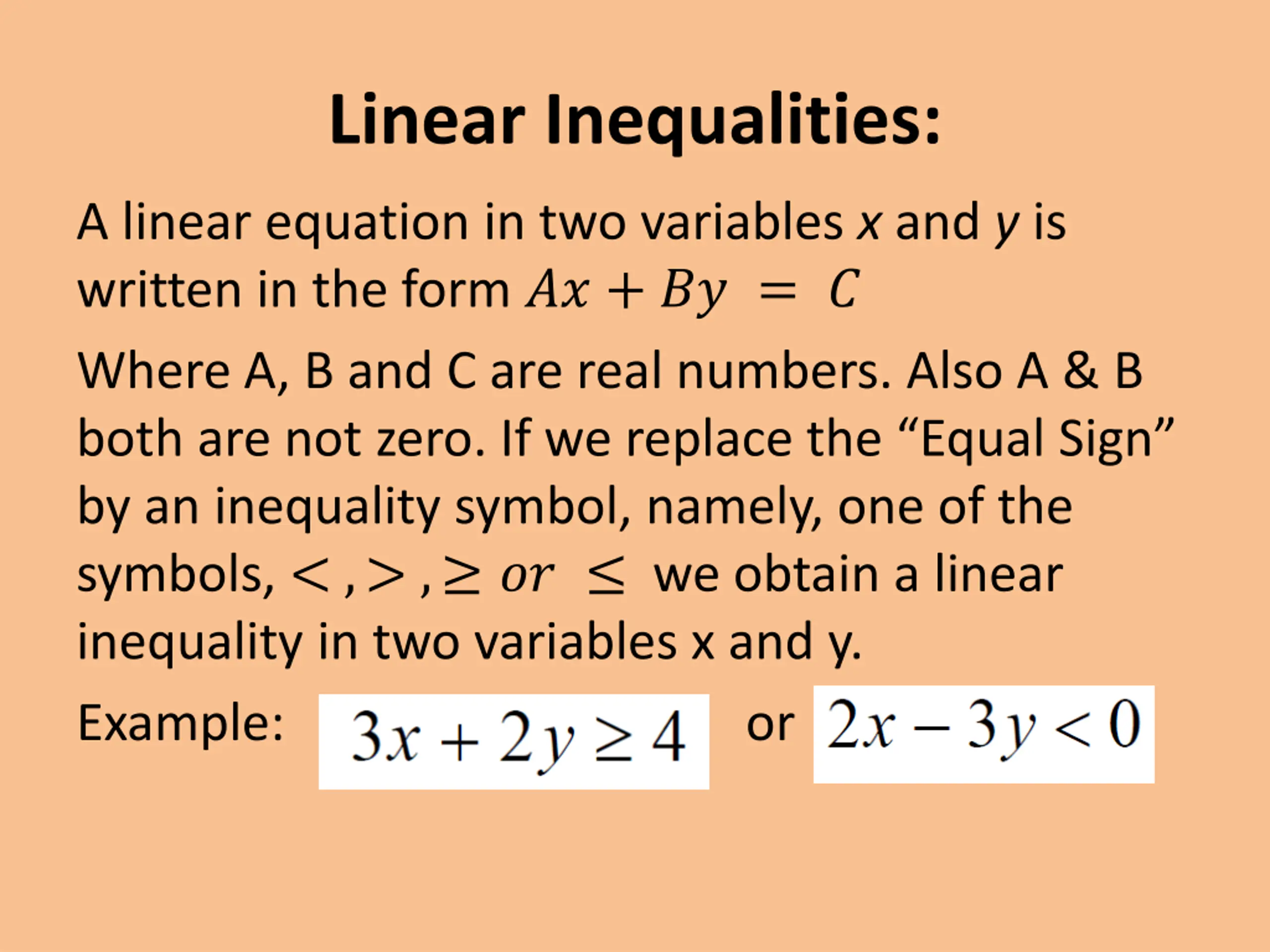 Linear Inequalities: A linear equation in two variables x and y is written in the form ?? + ?? = ? Where A, B and C are real numbers. Also A & B both are not zero. If we replace the Equal Sign by an inequality symbol, namely, one of the symbols, < ,> , ?? we obtain a linear inequality in two variables x and y. Example: or