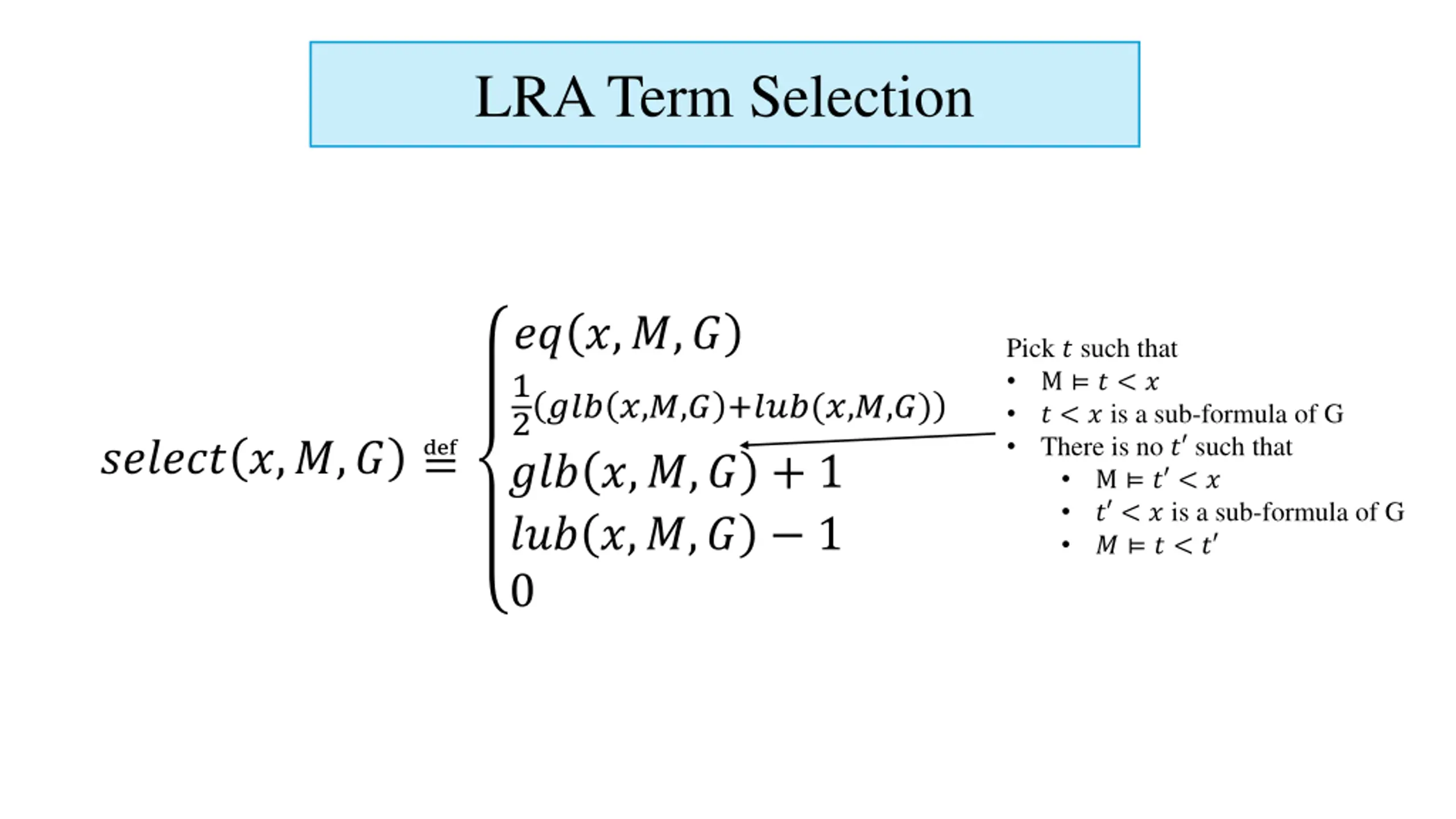 LRA Term Selection ?? ?,?,? 1 2??? ?,?,? +???(?,?,?) ??? ?,?,? + 1 ??? ?,?,? 1 0 Pick ? such that M ? < ? ? < ? is a sub-formula of G There is no ? such that M ? < ? ? < ? is a sub-formula of G ? ? < ? ?????? ?,?,?