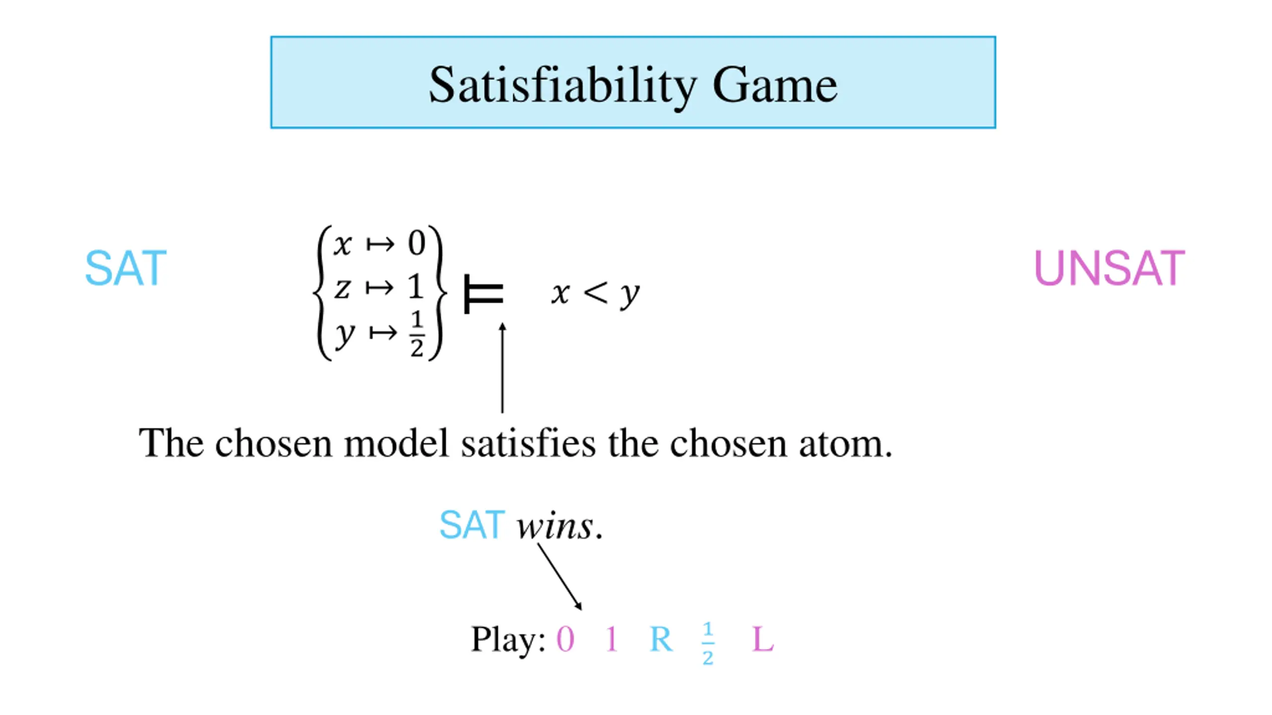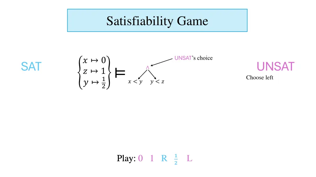 Satisfiability Game SAT s choice SAT Choose right UNSAT ? 0 ? 1 ? ? ? ? < ? ? < ? Play: 0 1 R Play: 0 1