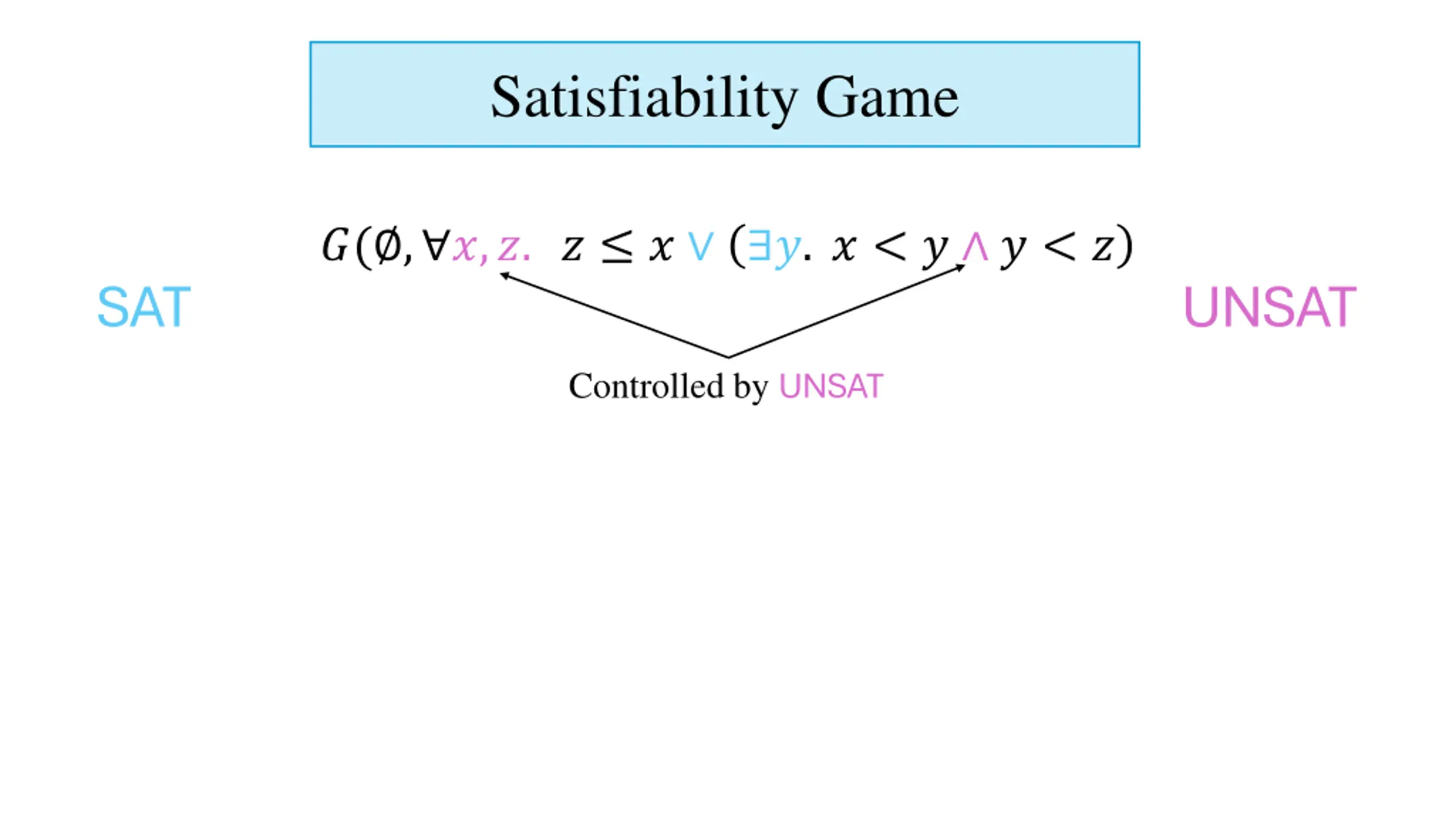 Satisfiability Game ?( , ?,?. ? ? ?. ? < ? ? < ? SAT UNSAT Controlled by UNSAT
