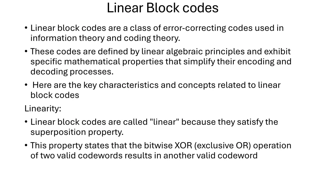 Linear Block codes Linear block codes are a class of error-correcting codes used in information theory and coding theory. These codes are defined by linear algebraic principles and exhibit specific mathematical properties that simplify their encoding and decoding processes. Here are the key characteristics and concepts related to linear block codes Linearity: Linear block codes are called "linear" because they satisfy the superposition property. This property states that the bitwise XOR (exclusive OR) operation of two valid codewords results in another valid codeword