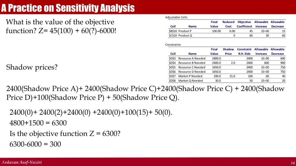A Practice on Sensitivity Analysis What is the value of the objective function? Z= 45(100) + 60(?)-6000! Adjustable Cells Final Value 100.00 Reduced Cost Objective Coefficient Allowable Allowable Increase 1E+30 30 Cell $B$10 Product P $C$10 Product Q Name Decrease 0.00 45 60 15 60 0 Constraints Final Value 1800.0 2400.0 1650.0 1650.0 100.0 30.0 Shadow Price Constraint Allowable Allowable R.H. Side Increase 2400 2400 2400 2400 100 50 Cell $D$3 Resource A Needed $D$4 Resource B Needed $D$5 Resource C Needed $D$6 Resource D Needed $D$7 Market P Needed $D$8 Market Q Needed Name Decrease 1E+30 600 1E+30 1E+30 600 900 750 750 40 20 2.0 Shadow prices? 15.0 60 1E+30 2400(Shadow Price A)+ 2400(Shadow Price C)+2400(Shadow Price C) + 2400(Shadow Price D)+100(Shadow Price P) + 50(Shadow Price Q). 2400(0)+ 2400(2)+2400(0) +2400(0)+100(15)+ 50(0). 4800+1500 = 6300 Is the objective function Z = 6300? 6300-6000 = 300 Ardavan Asef-Vaziri 14