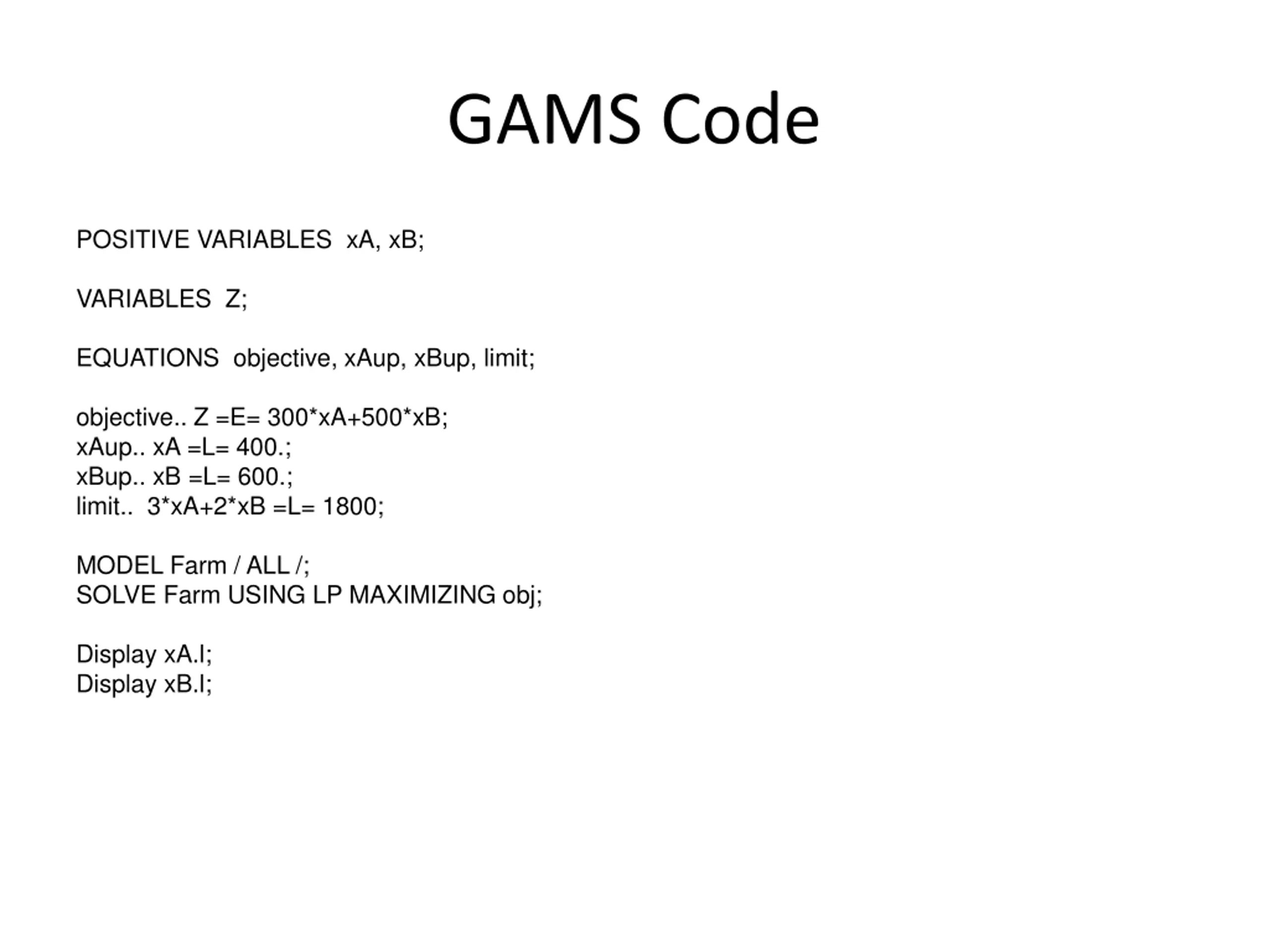 GAMS Code POSITIVE VARIABLES xA, xB; VARIABLES Z; EQUATIONS objective, xAup, xBup, limit; objective.. Z =E= 300*xA+500*xB; xAup.. xA =L= 400.; xBup.. xB =L= 600.; limit.. 3*xA+2*xB =L= 1800; MODEL Farm / ALL /; SOLVE Farm USING LP MAXIMIZING obj; Display xA.l; Display xB.l;