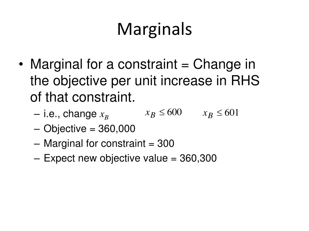 Marginals Marginal for a constraint = Change in the objective per unit increase in RHS of that constraint. i.e., change xB Objective = 360,000 Marginal for constraint = 300 Expect new objective value = 360,300 600 x 601 x B B