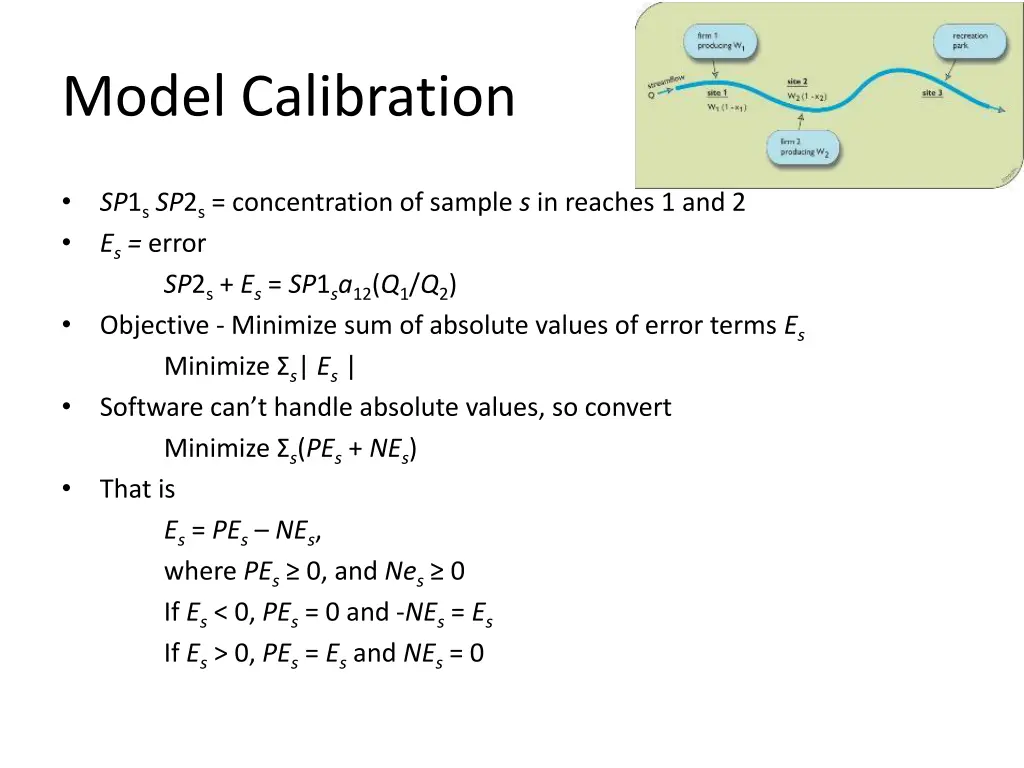 Model Calibration SP1sSP2s = concentration of sample s in reaches 1 and 2 Es = error SP2s + Es = SP1sa12(Q1/Q2) Objective - Minimize sum of absolute values of error terms Es Minimize s| Es| Software can t handle absolute values, so convert Minimize s(PEs + NEs) That is Es = PEs NEs, where PEs 0, and Nes 0 If Es < 0, PEs = 0 and -NEs = Es If Es > 0, PEs = Es and NEs = 0