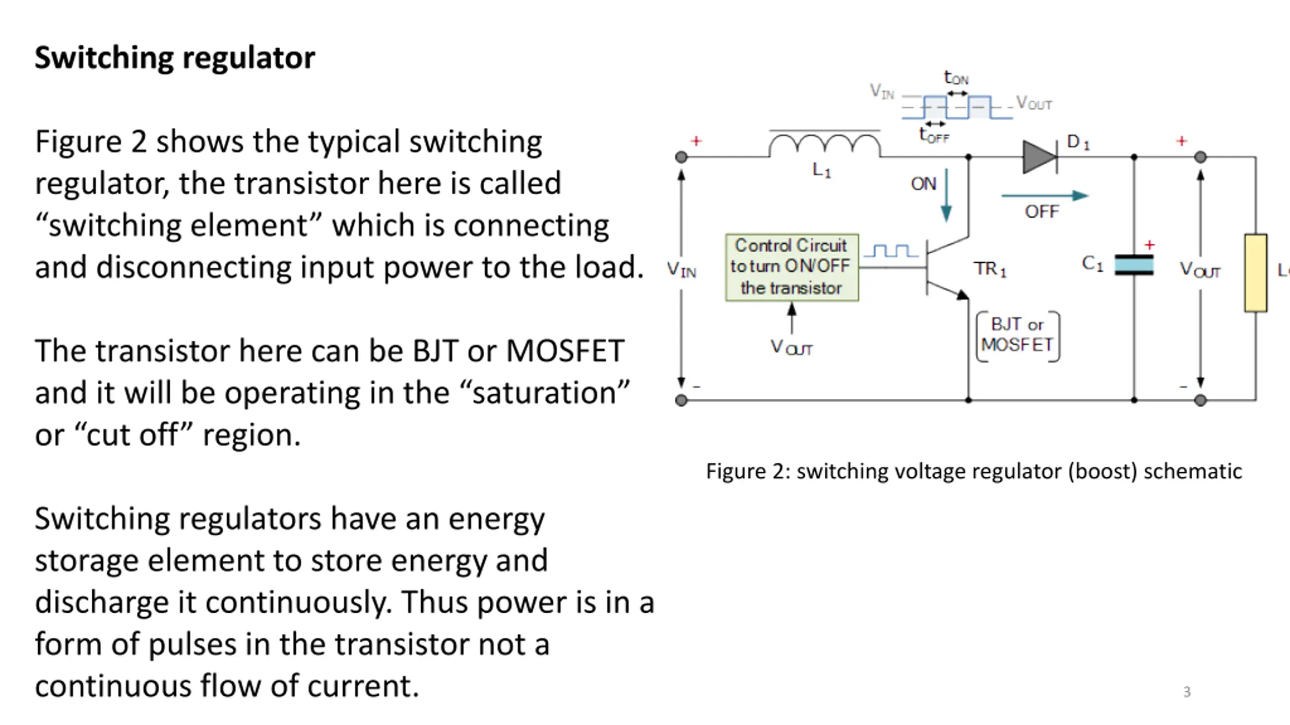 Switching regulator Figure 2 shows the typical switching regulator, the transistor here is called switching element which is connecting and disconnecting input power to the load. The transistor here can be BJT or MOSFET and it will be operating in the saturation or cut off region. Figure 2: switching voltage regulator (boost) schematic Switching regulators have an energy storage element to store energy and discharge it continuously. Thus power is in a form of pulses in the transistor not a continuous flow of current. 3
