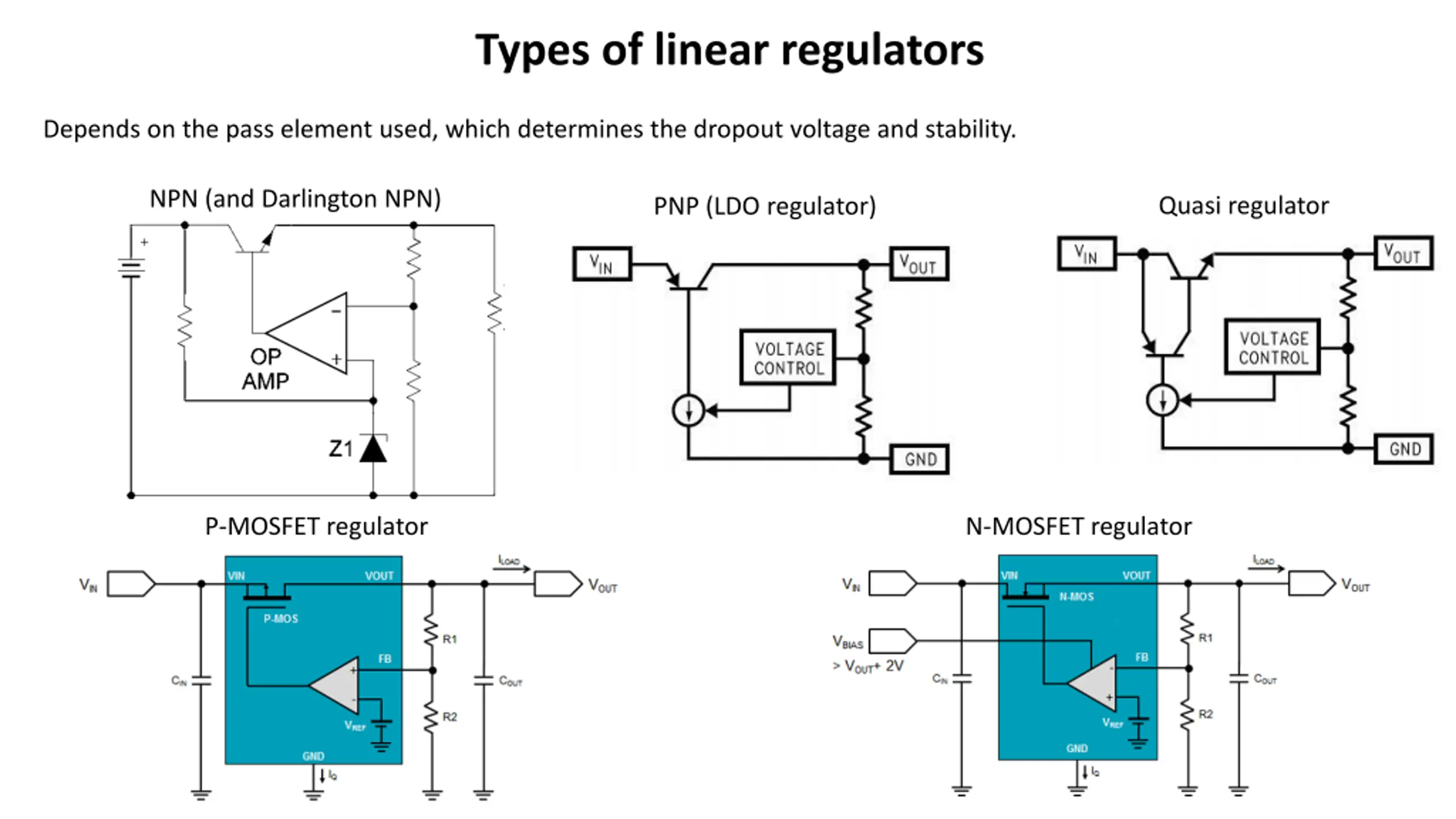 Types of linear regulators Depends on the pass element used, which determines the dropout voltage and stability. NPN (and Darlington NPN) Quasi regulator PNP (LDO regulator) P-MOSFET regulator N-MOSFET regulator 5