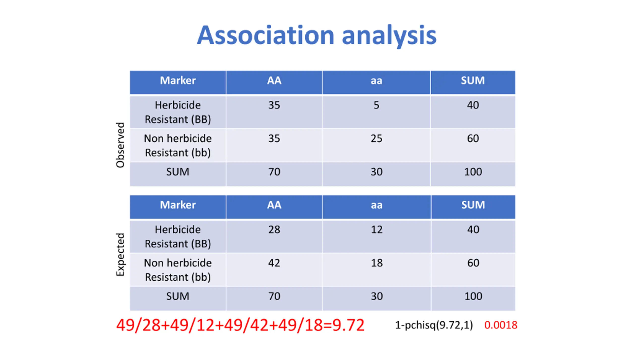 Association analysis Marker AA aa SUM Herbicide Resistant (BB) 35 5 40 Observed Non herbicide Resistant (bb) 35 25 60 SUM 70 30 100 Marker AA aa SUM Herbicide Resistant (BB) 28 12 40 Expected Non herbicide Resistant (bb) 42 18 60 SUM 70 30 100 49/28+49/12+49/42+49/18=9.72 1-pchisq(9.72,1) 0.0018