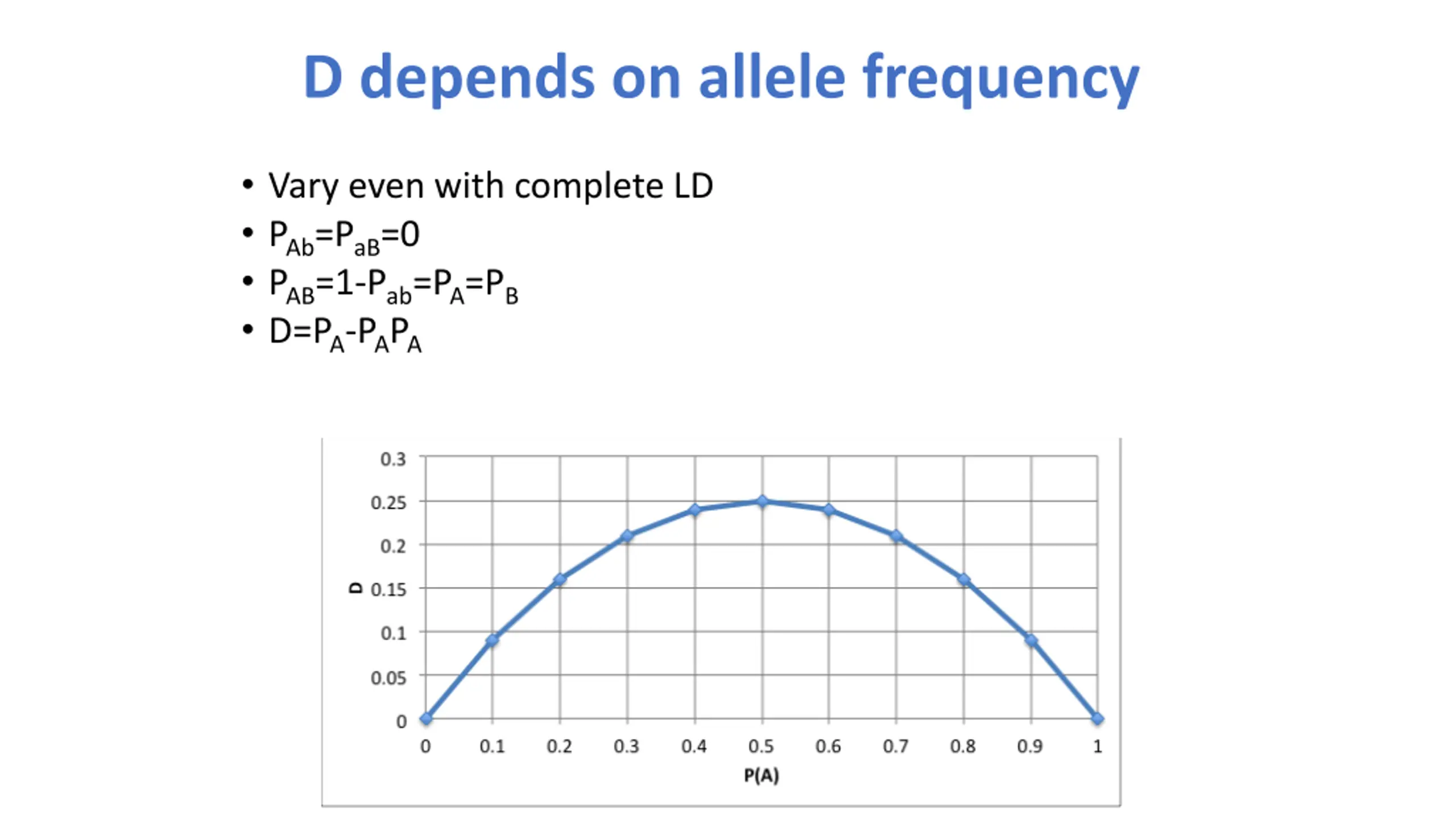 D depends on allele frequency Vary even with complete LD PAb=PaB=0 PAB=1-Pab=PA=PB D=PA-PAPA