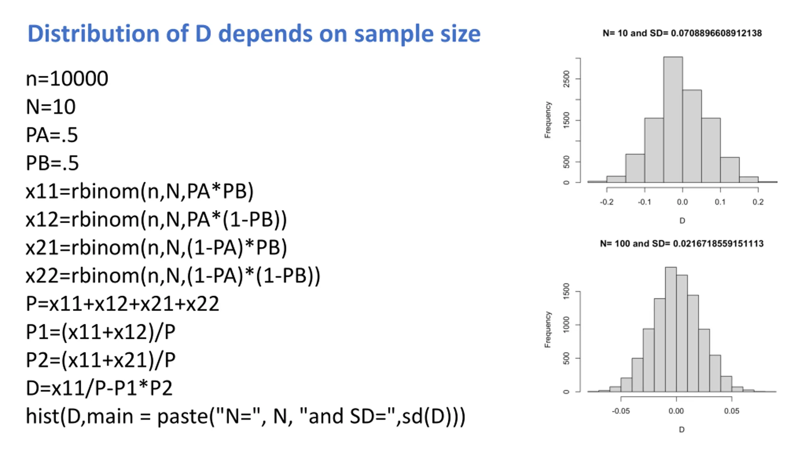 Distribution of D depends on sample size n=10000 N=10 PA=.5 PB=.5 x11=rbinom(n,N,PA*PB) x12=rbinom(n,N,PA*(1-PB)) x21=rbinom(n,N,(1-PA)*PB) x22=rbinom(n,N,(1-PA)*(1-PB)) P=x11+x12+x21+x22 P1=(x11+x12)/P P2=(x11+x21)/P D=x11/P-P1*P2 hist(D,main = paste("N=", N, "and SD=",sd(D)))