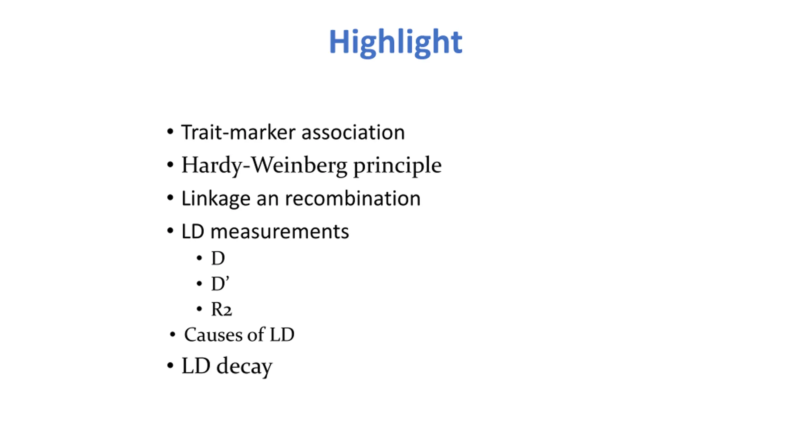 Highlight Trait-marker association Hardy-Weinberg principle Linkage an recombination LD measurements D D R2 Causes of LD LD decay