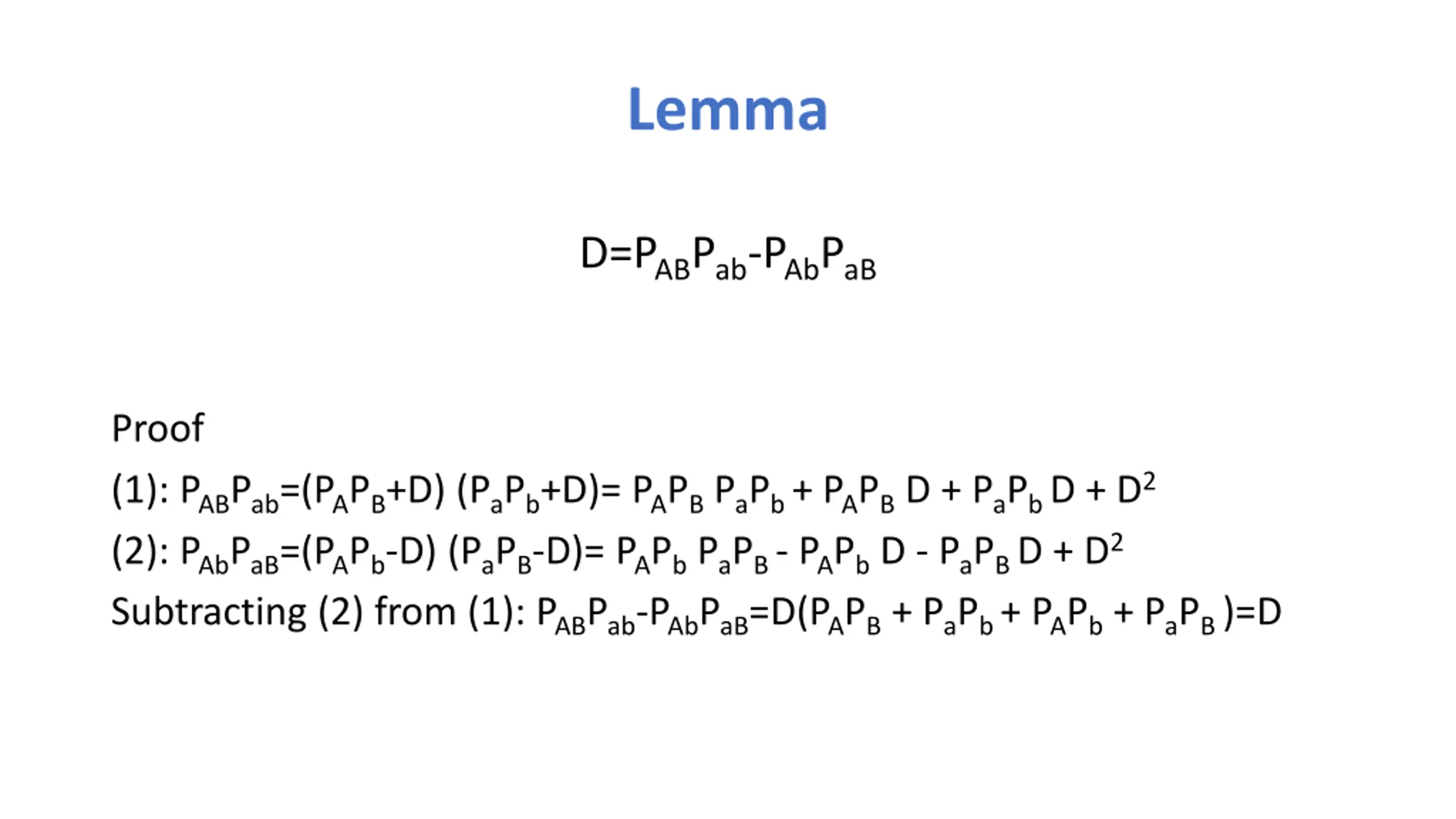 Lemma D=PABPab-PAbPaB Proof (1): PABPab=(PAPB+D) (PaPb+D)= PAPB PaPb + PAPB D + PaPb D + D2 (2): PAbPaB=(PAPb-D) (PaPB-D)= PAPb PaPB - PAPb D - PaPB D + D2 Subtracting (2) from (1): PABPab-PAbPaB=D(PAPB + PaPb + PAPb + PaPB )=D